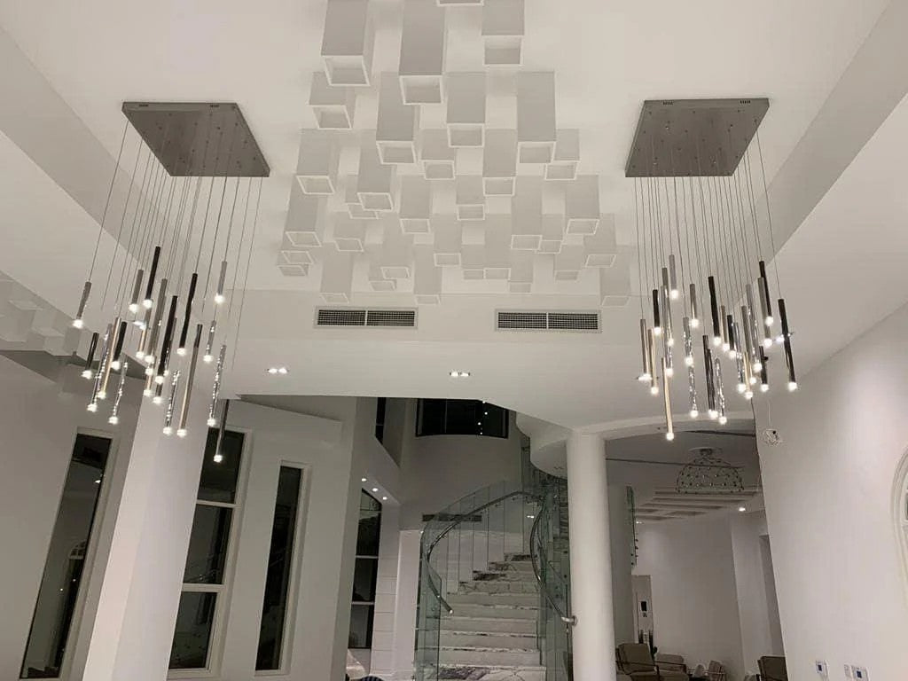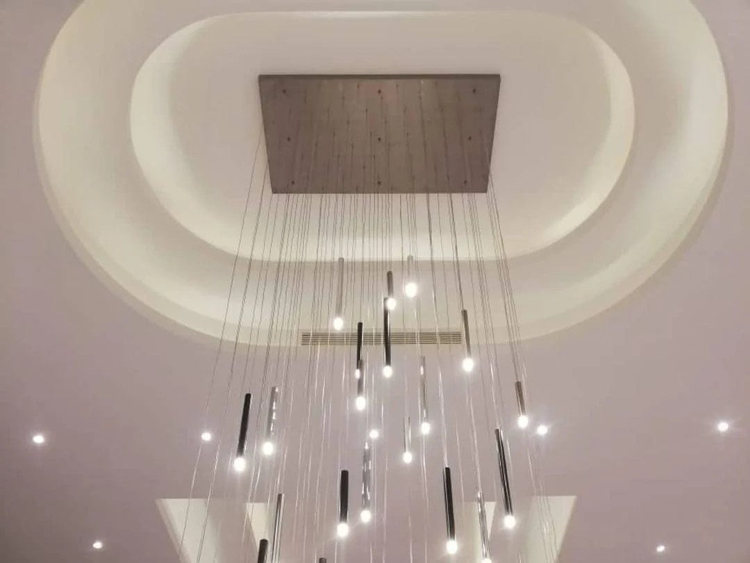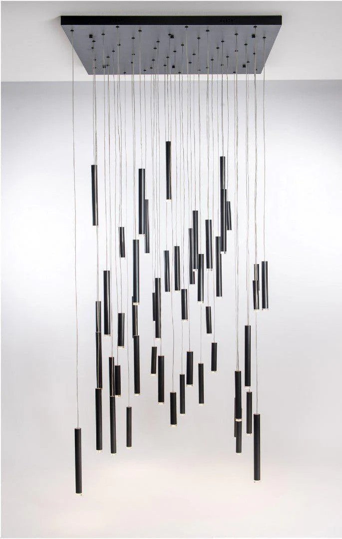 The Nova Droplet Chandelier Collection (circular/linear/bar silhouettes) features a matte black canopy paired with gold-plated metal rods—suspended at varying lengths, they cast a layered, starry glow. Ideal for high-ceiling spaces (living rooms, foyers), this modern collection balances minimalist geometry with luxe texture, elevating contemporary American interiors with understated, sculptural drama.
