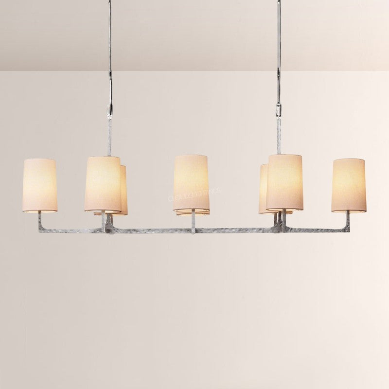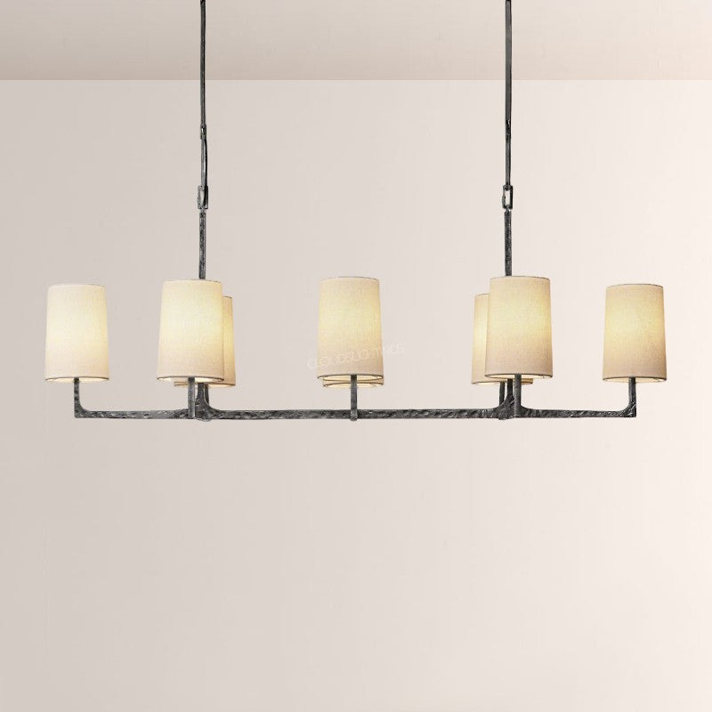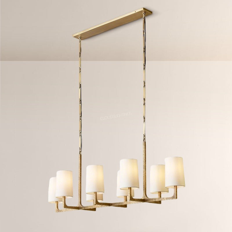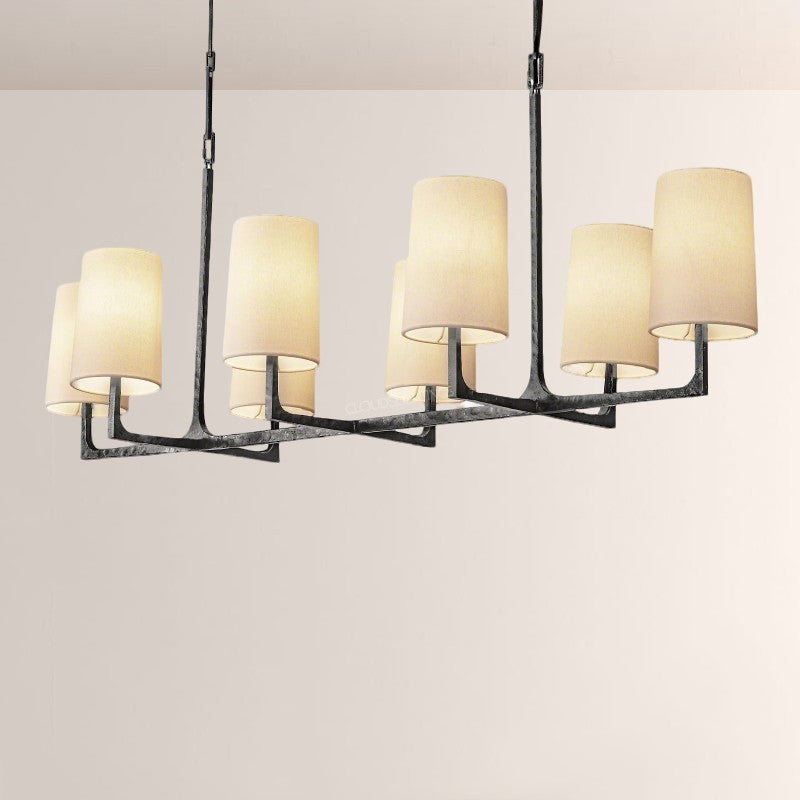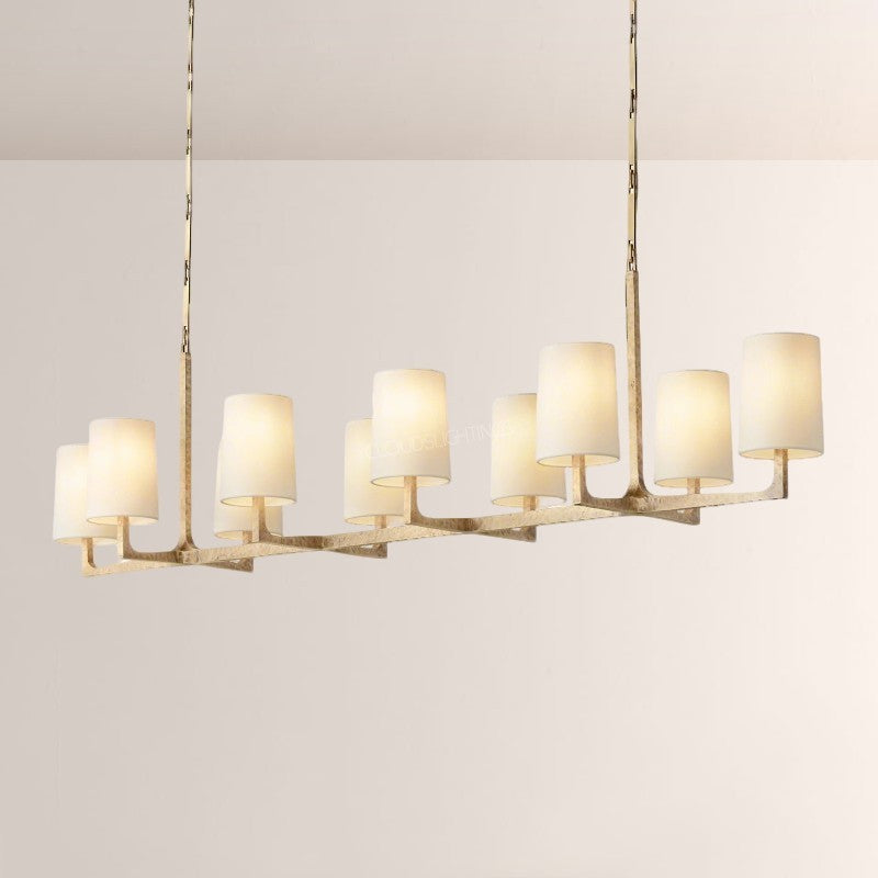 | The Wright Hammered Iron Chandelier blends artisanal hammered iron (in warm gold-tone) with soft fabric shades—its starburst frame adds sculptural drama, while the linen-like shades diffuse gentle, ambient light. Perfect for modern dining rooms or open-concept living spaces, this piece balances industrial texture with approachable elegance, elevating contemporary American interiors. |