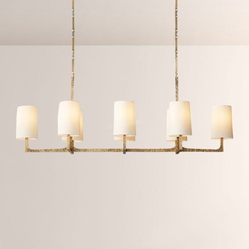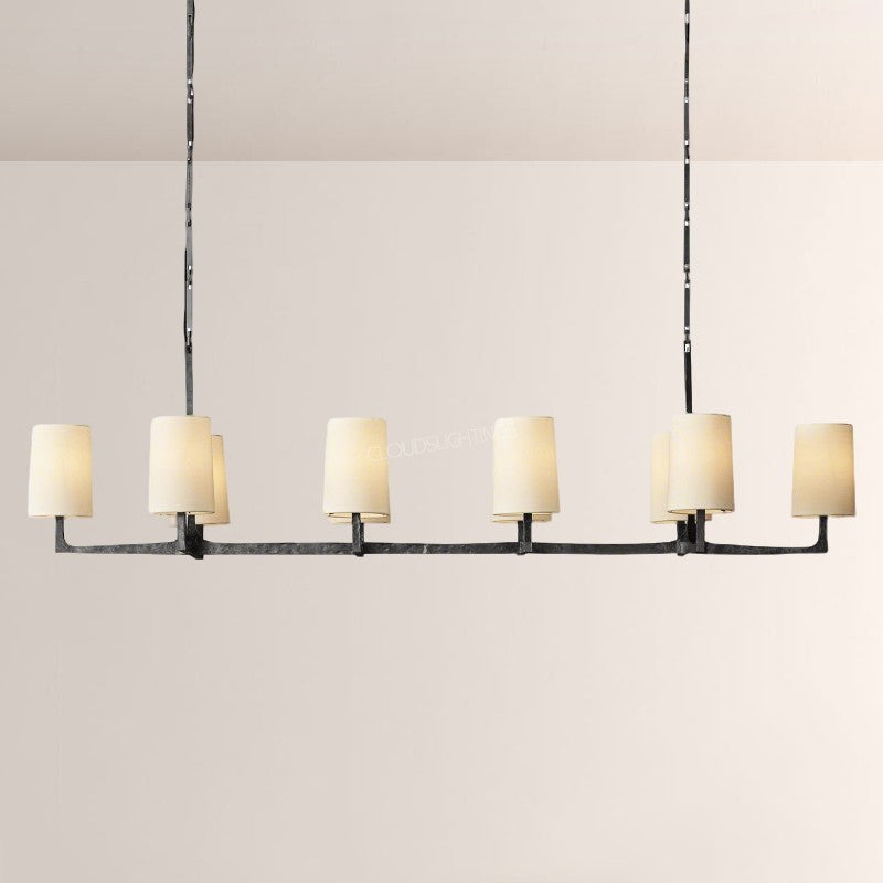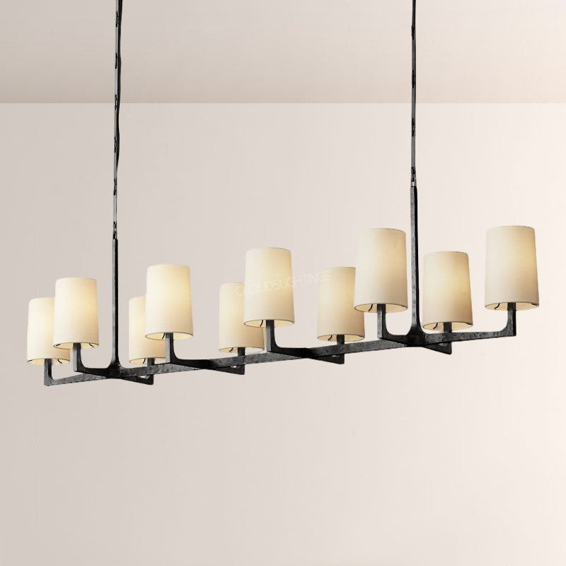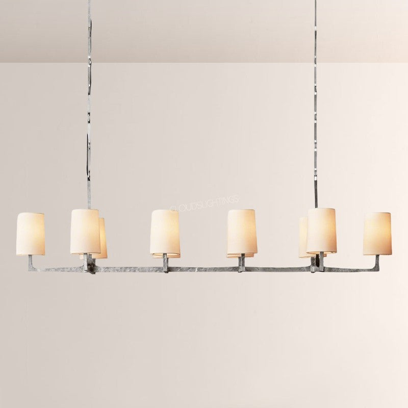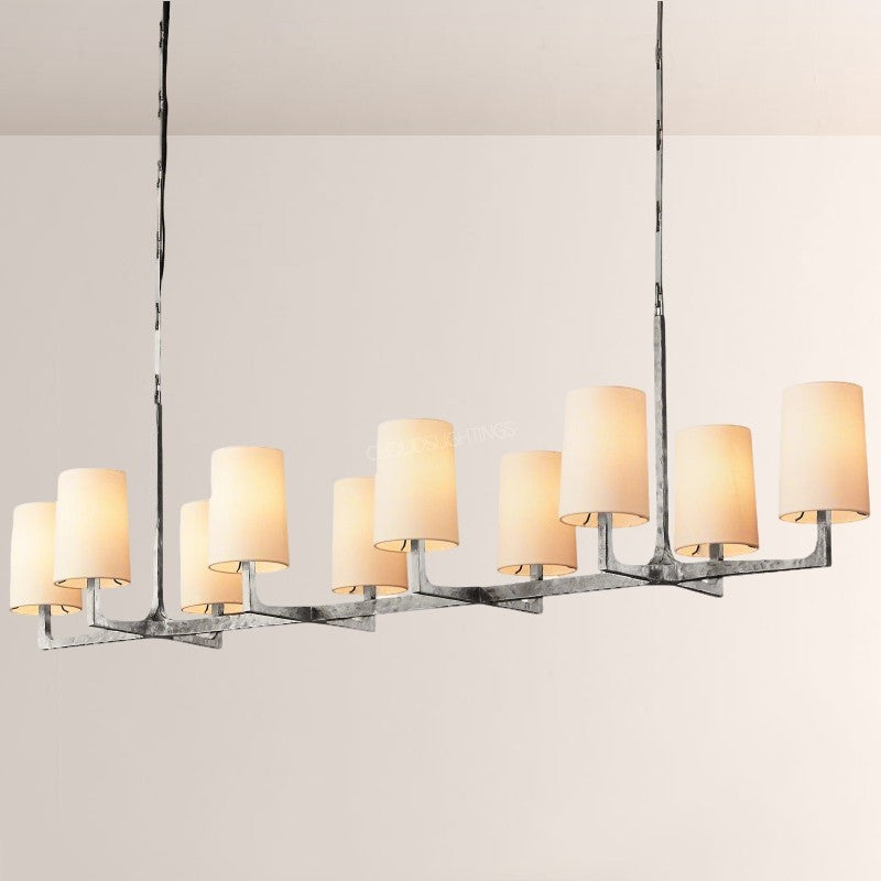 | The Wright Hammered Iron Chandelier blends artisanal hammered iron (in warm gold-tone) with soft fabric shades—its starburst frame adds sculptural drama, while the linen-like shades diffuse gentle, ambient light. Perfect for modern dining rooms or open-concept living spaces, this piece balances industrial texture with approachable elegance, elevating contemporary American interiors. |