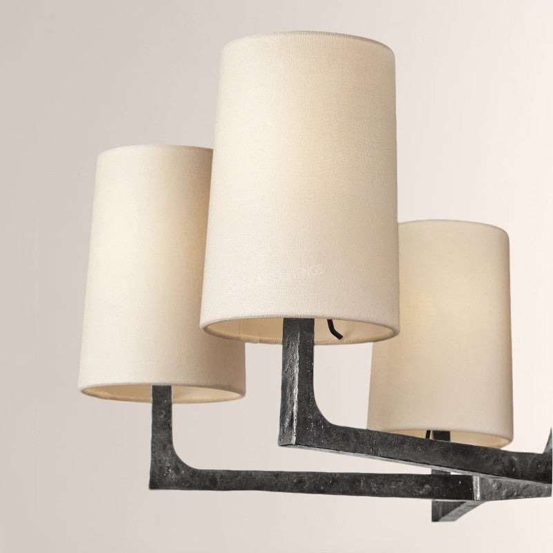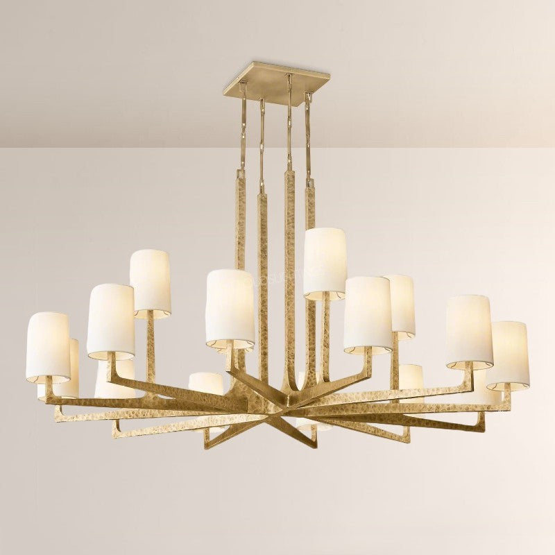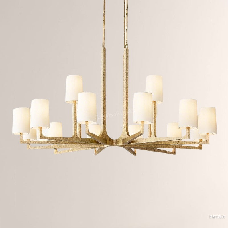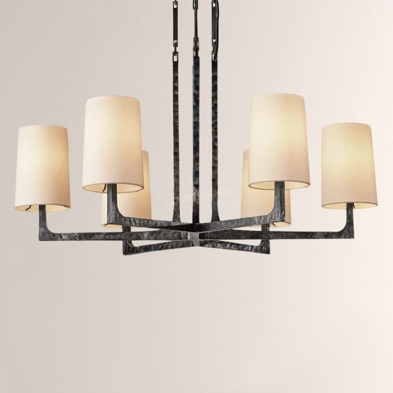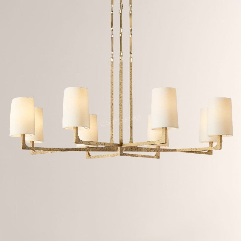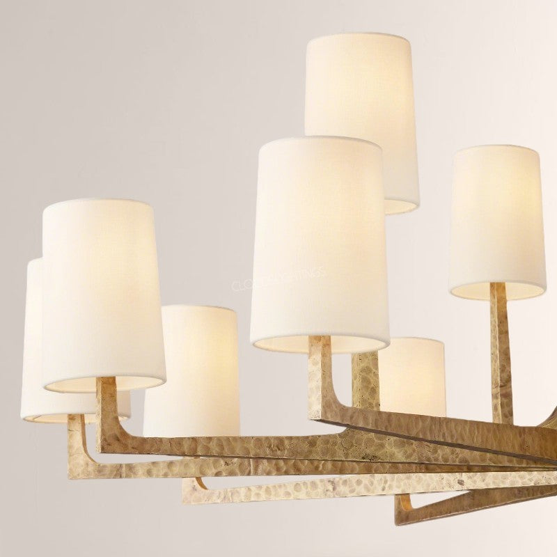 | The Wright Hammered Iron Chandelier blends artisanal hammered iron (in warm gold-tone) with soft fabric shades—its starburst frame adds sculptural drama, while the linen-like shades diffuse gentle, ambient light. Perfect for modern dining rooms or open-concept living spaces, this piece balances industrial texture with approachable elegance, elevating contemporary American interiors. |