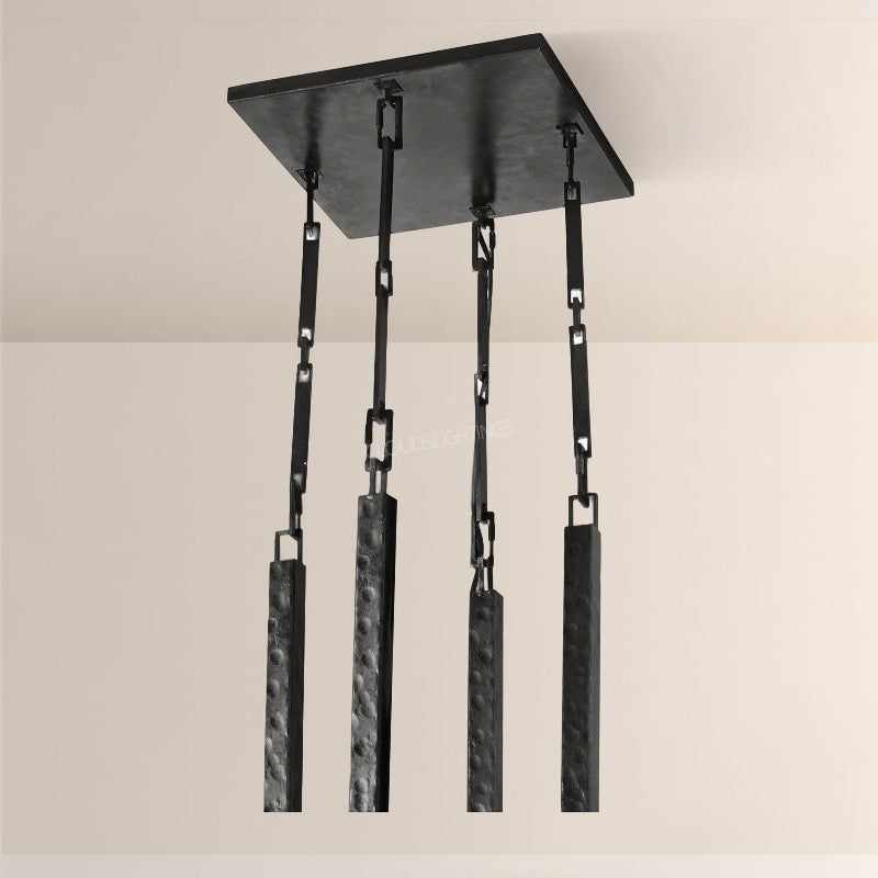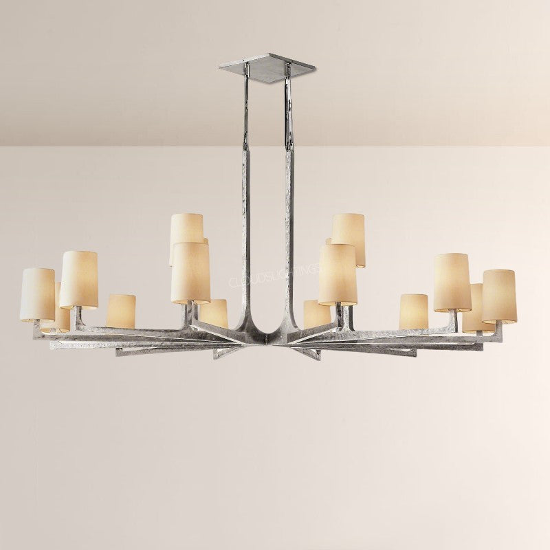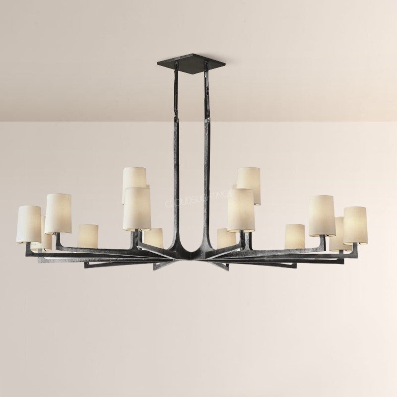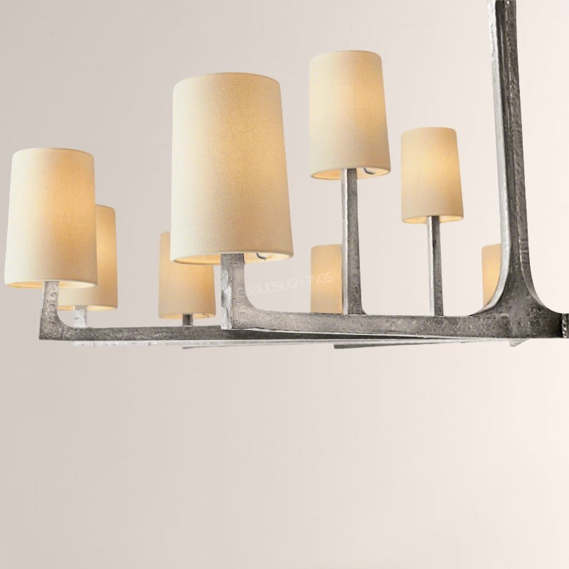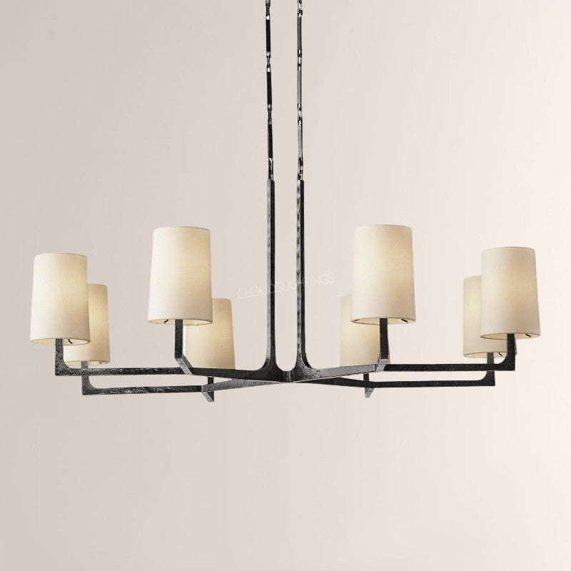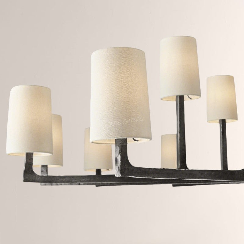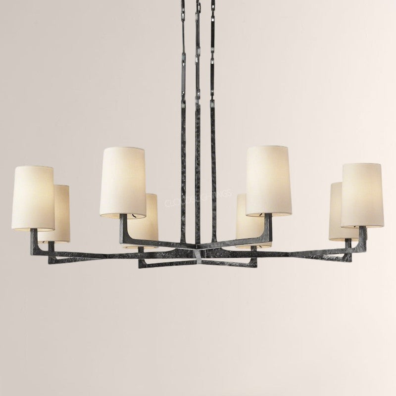 | The Wright Hammered Iron Chandelier blends artisanal hammered iron (in warm gold-tone) with soft fabric shades—its starburst frame adds sculptural drama, while the linen-like shades diffuse gentle, ambient light. Perfect for modern dining rooms or open-concept living spaces, this piece balances industrial texture with approachable elegance, elevating contemporary American interiors. |
