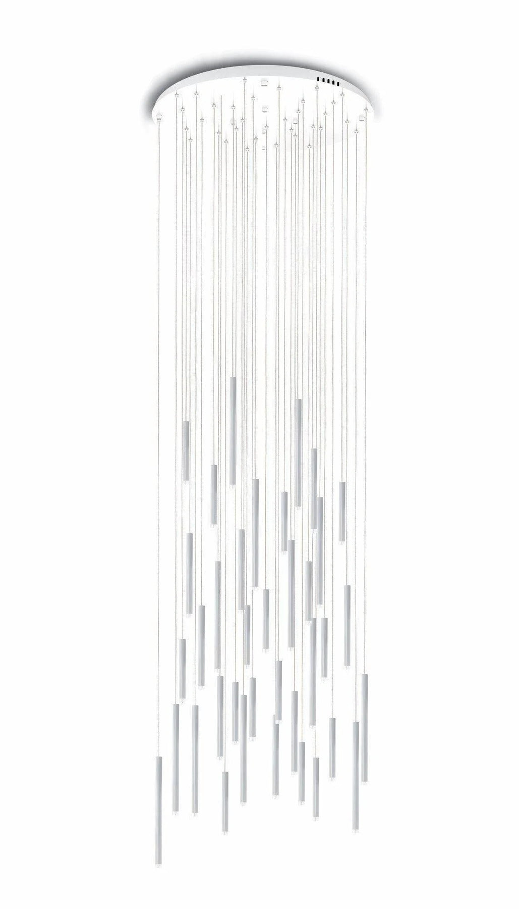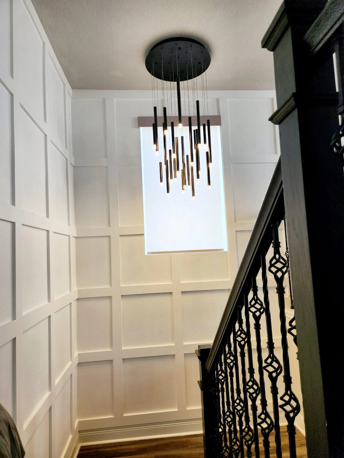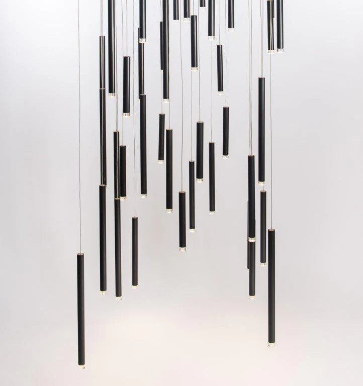 The Nova Droplet Chandelier Collection (circular/linear/bar silhouettes) features a matte black canopy paired with gold-plated metal rods—suspended at varying lengths, they cast a layered, starry glow. Ideal for high-ceiling spaces (living rooms, foyers), this modern collection balances minimalist geometry with luxe texture, elevating contemporary American interiors with understated, sculptural drama.