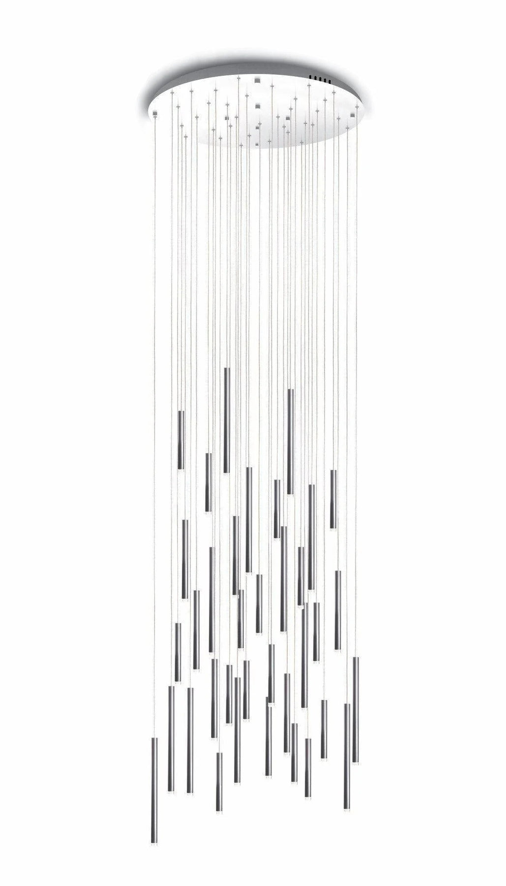 Three Sizes of pendants are mixed in random formation for this pendant light