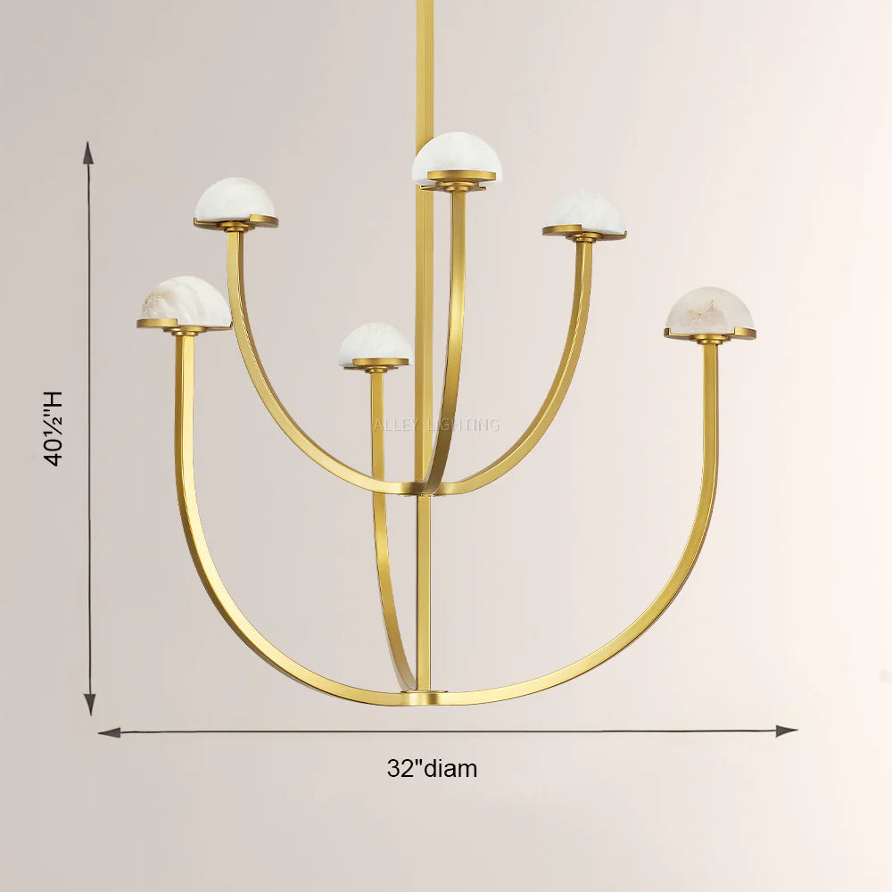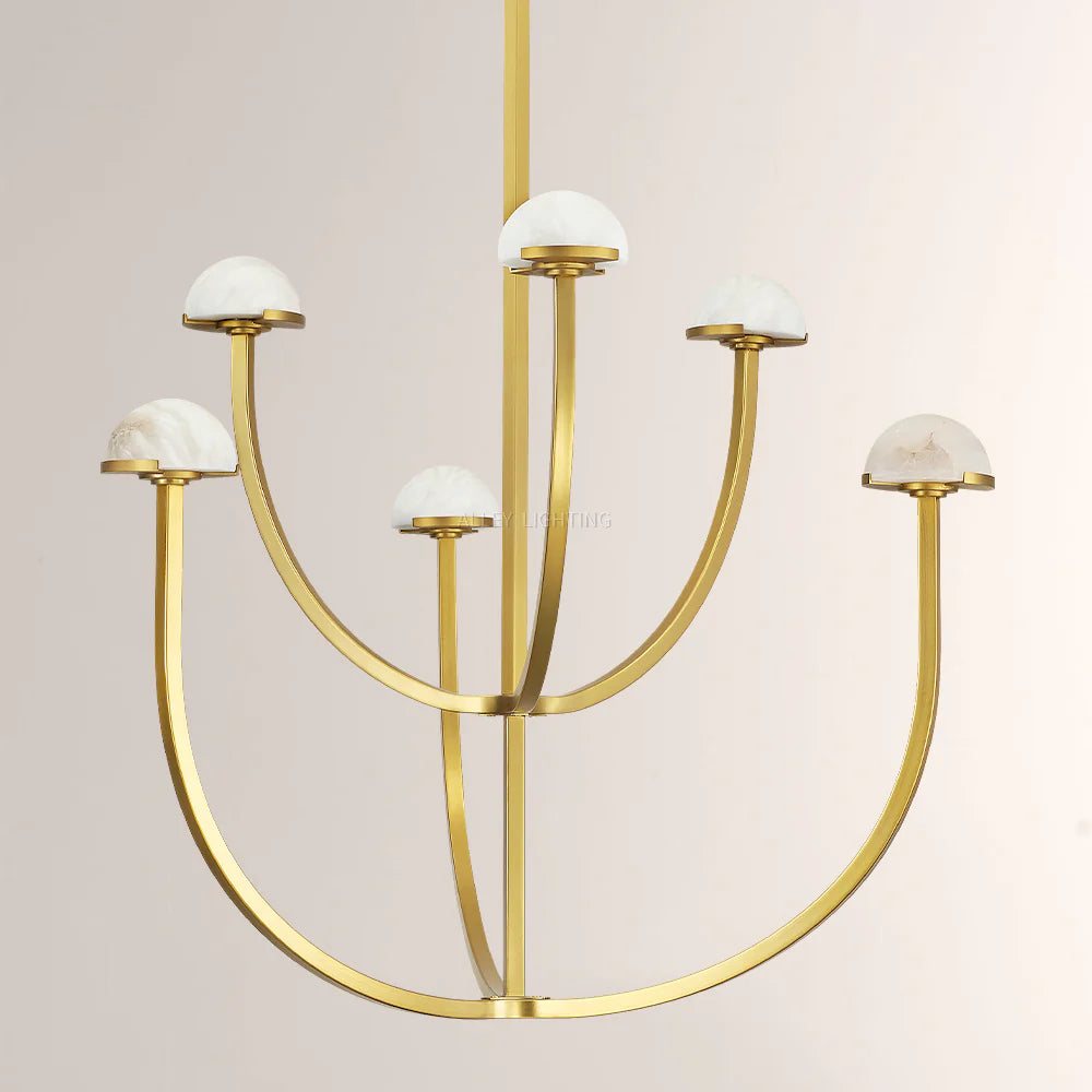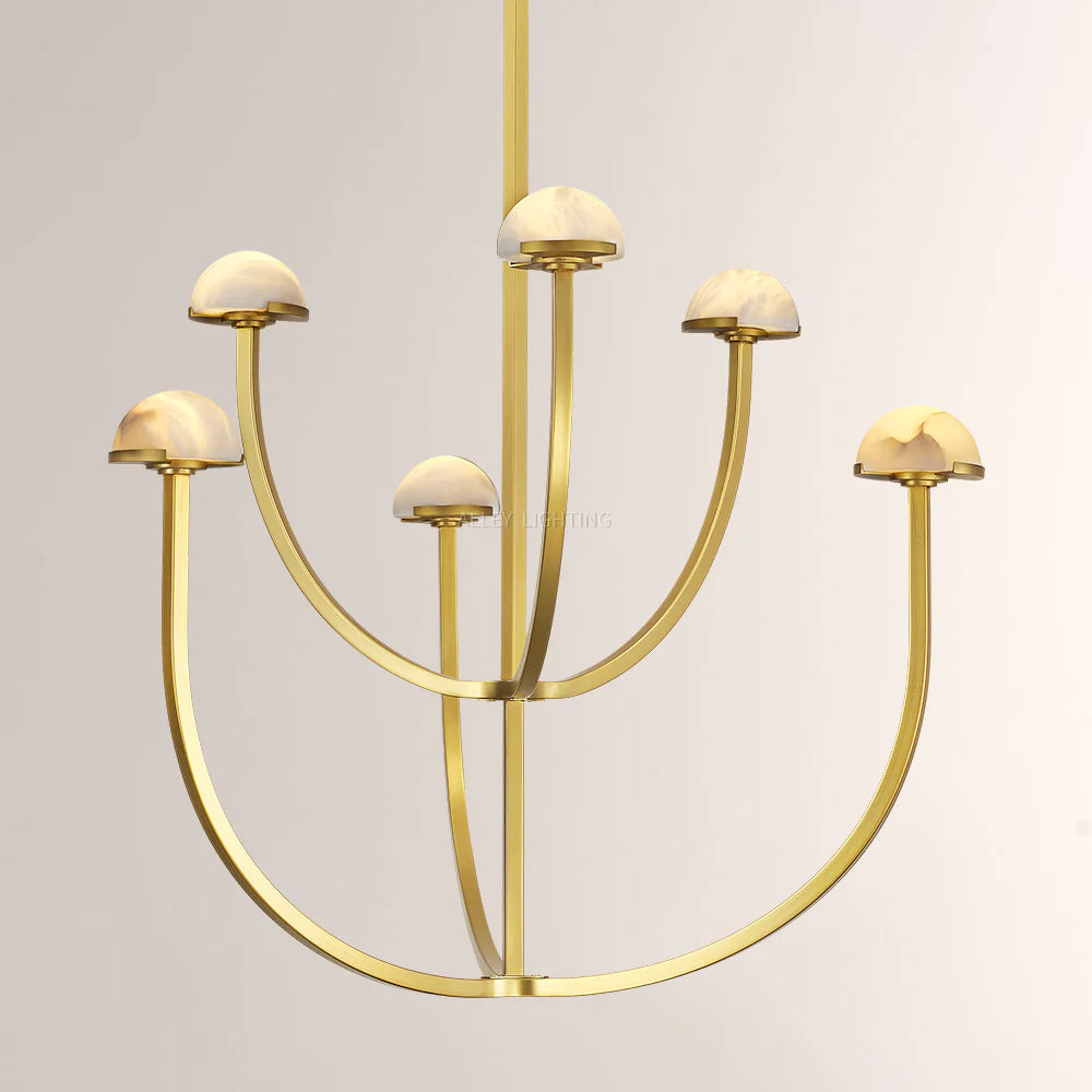 Minimalist in design yet maximalist in effect, our lighting collection was inspired by a midcentury Italian silhouette. Metal armatures reminiscent of architectural tracery support a constellation of dome-shaped, translucent alabaster shades that highlight the stone's natural veining and coloration. The sculptural form emits a warm, filtered glow.