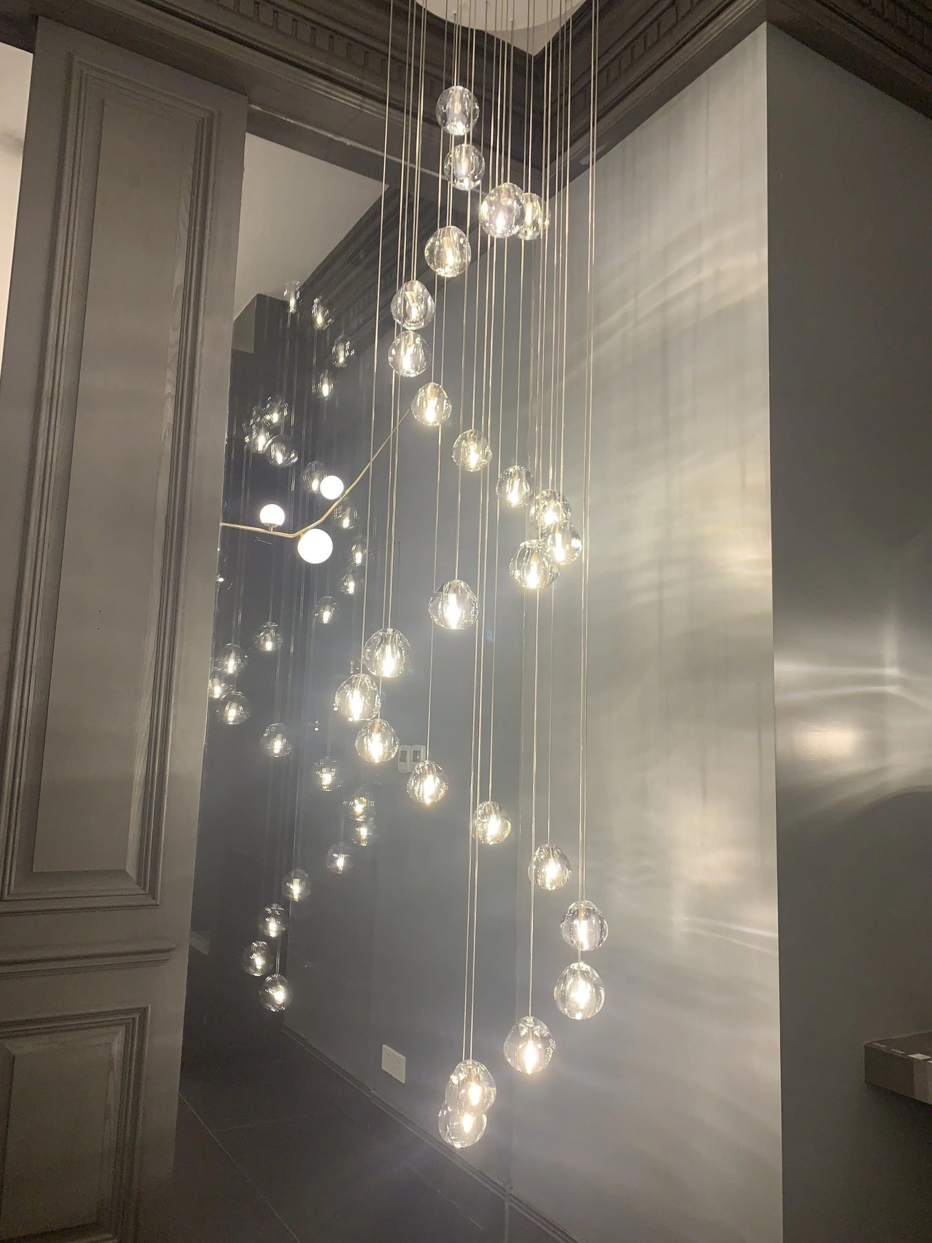 The Aether Orb Cluster Pendant Collection features clusters of glowing spherical orbs suspended from slim, nearly invisible cables, creating a floating, constellation-like effect. Warm, soft light emanates from each orb, blending minimalist elegance with ethereal ambiance. Perfect for stairwells, entry foyers, or above dining tables, it adds a modern, sculptural focal point to contemporary American interiors.