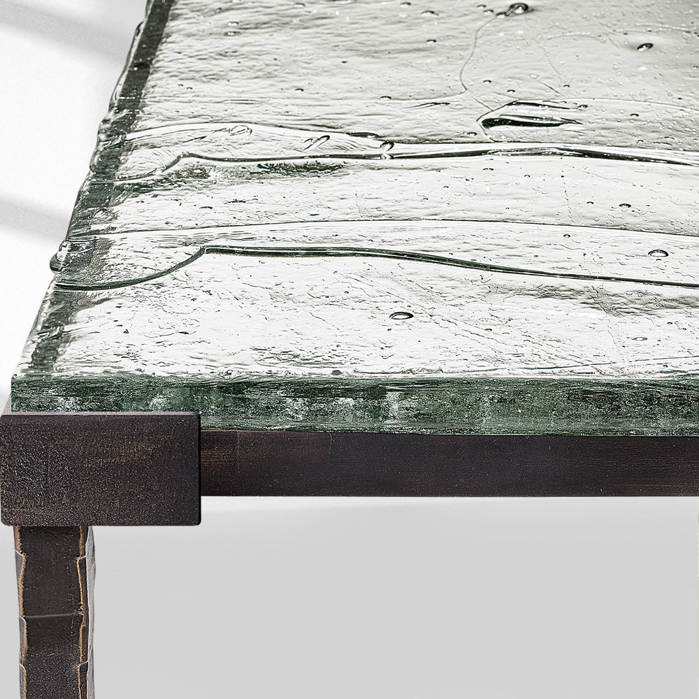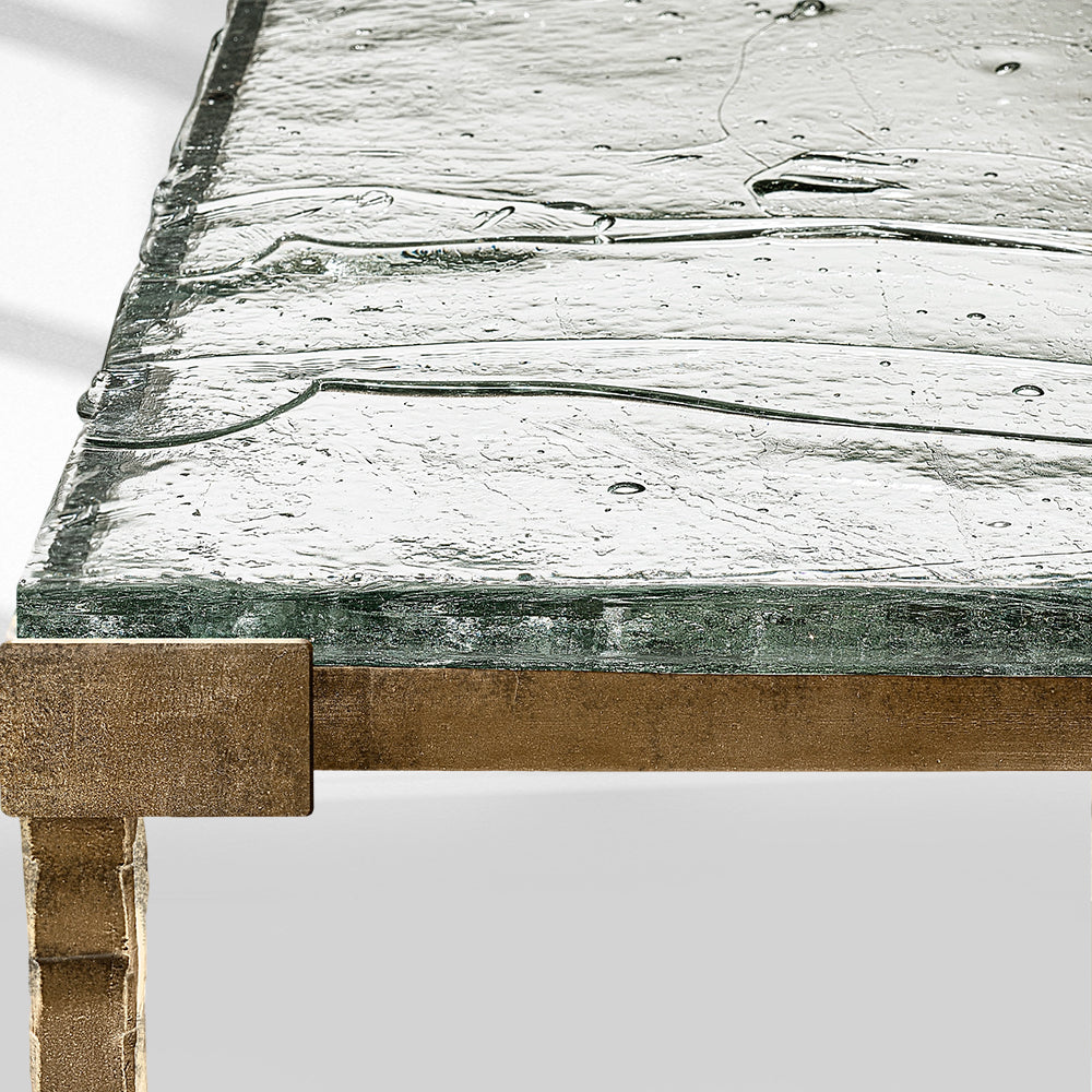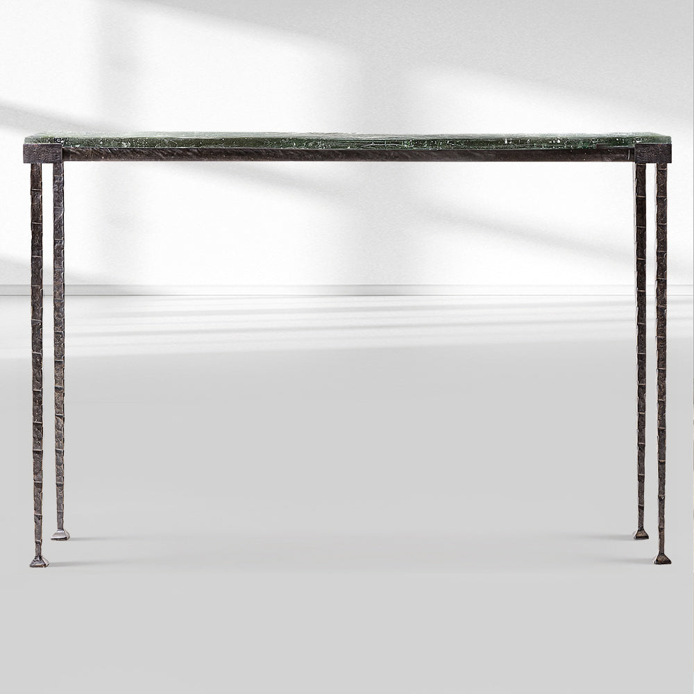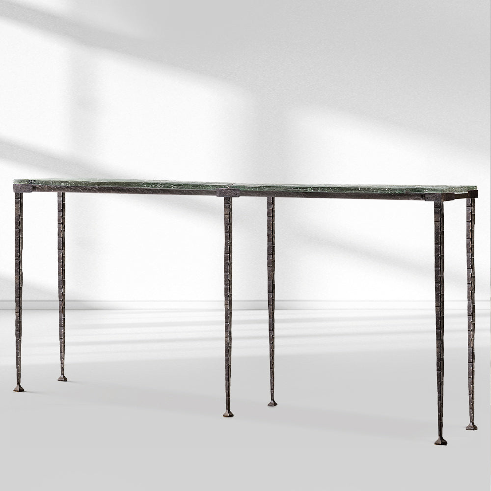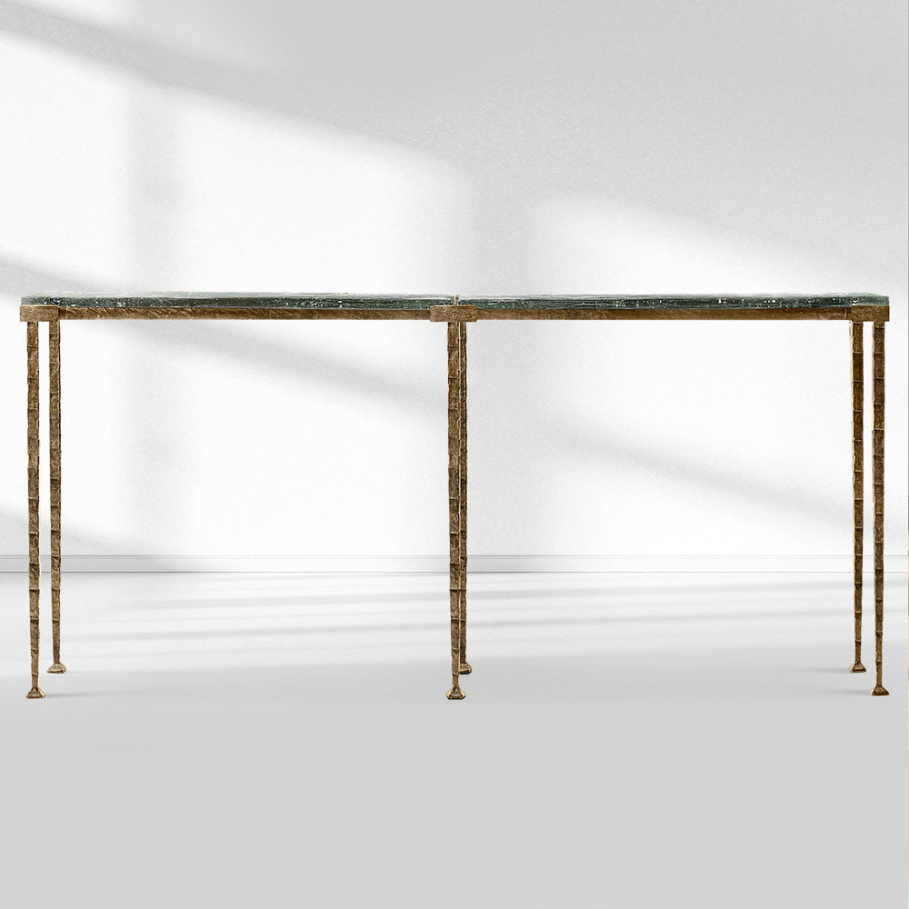 The Adilon Series Console Table features a textured glass top available in multiple finishes, paired with an aged metal base, blending artistic craftsmanship and luxury elegance. It’s an ideal statement piece for upscale American entryways or living spaces, offering a design that balances unique textural aesthetics with refined detailing, perfect for elevating high-end interiors with its sophisticated, artistic charm.