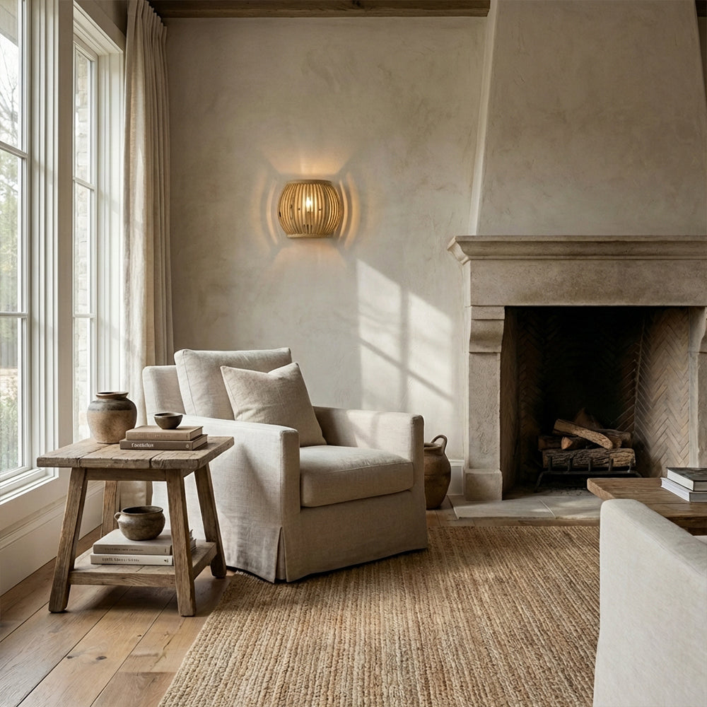 Hand-forged in Hiroshi Gray, the Afra Sconce features natural Arurog reeds secured by rattan bands. A tactile, semi-circular light for sophisticated spaces.