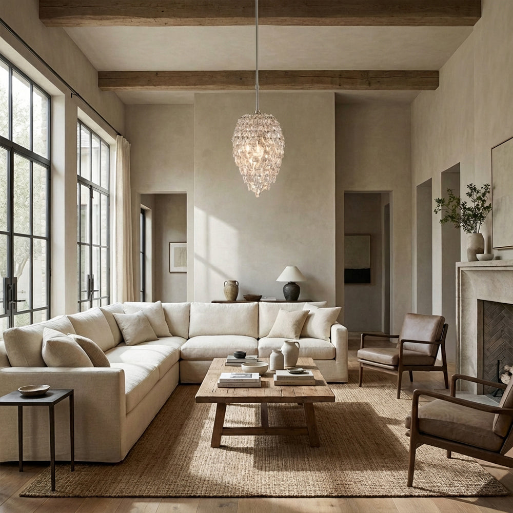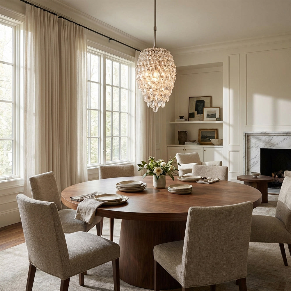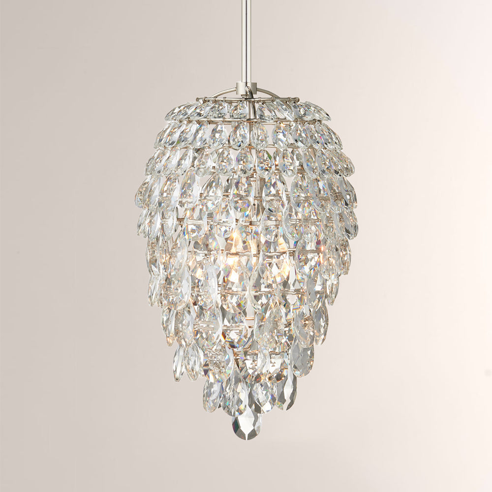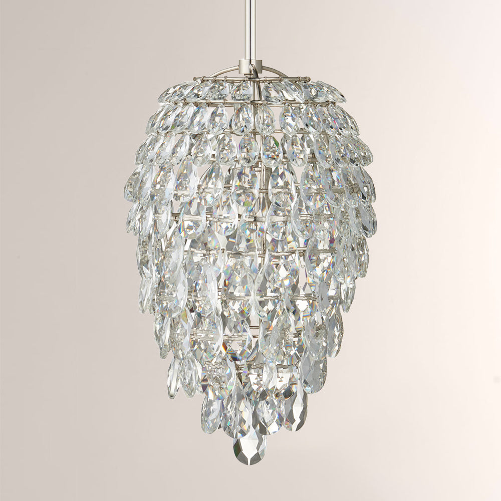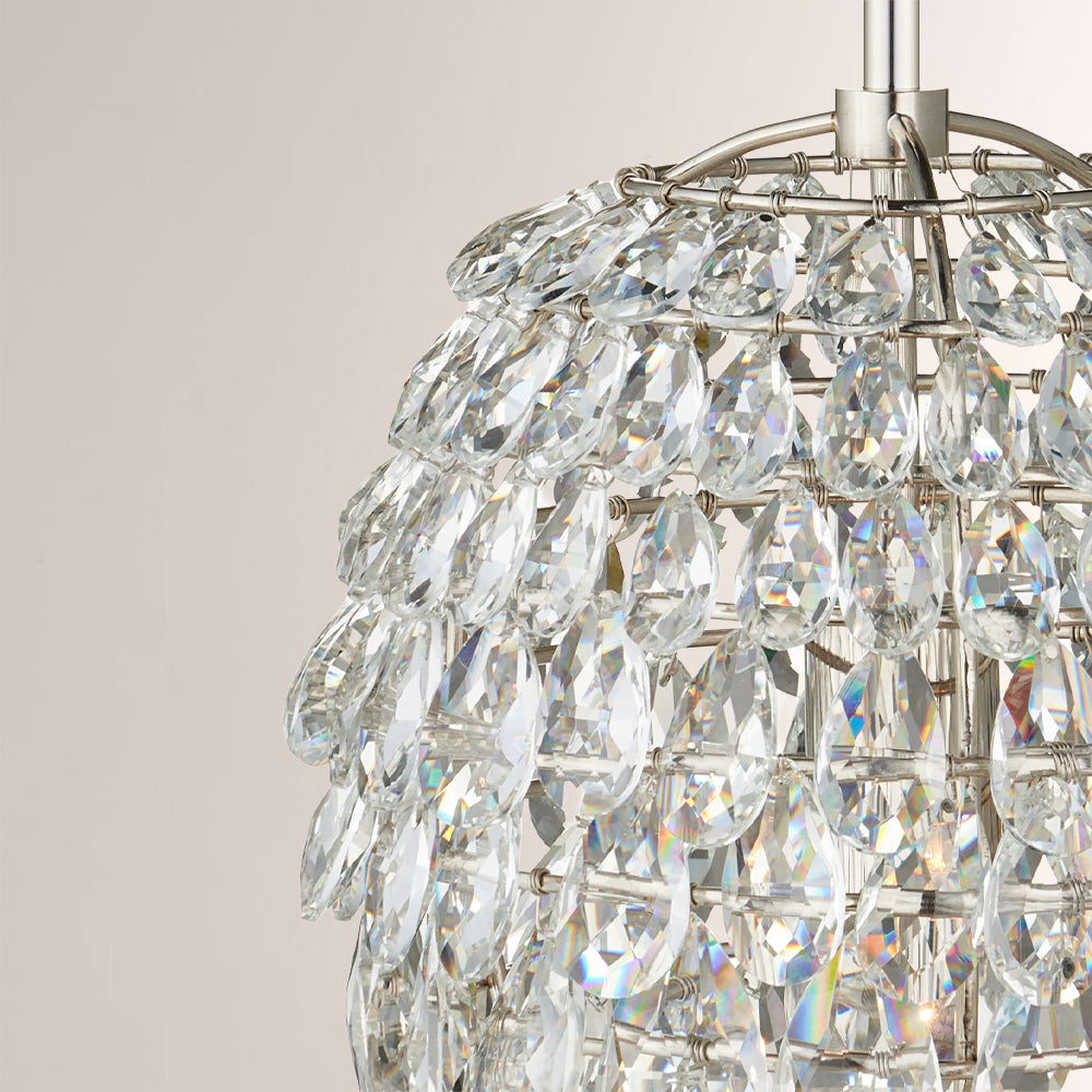 Aisla Crystal Pendant: Hand-set teardrop optic crystals on polished nickel. A brilliant, jewelry-inspired statement piece bringing radiant luxury to any room.