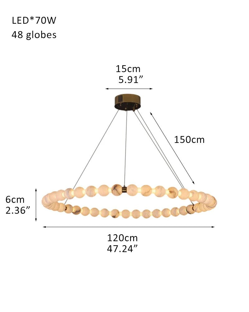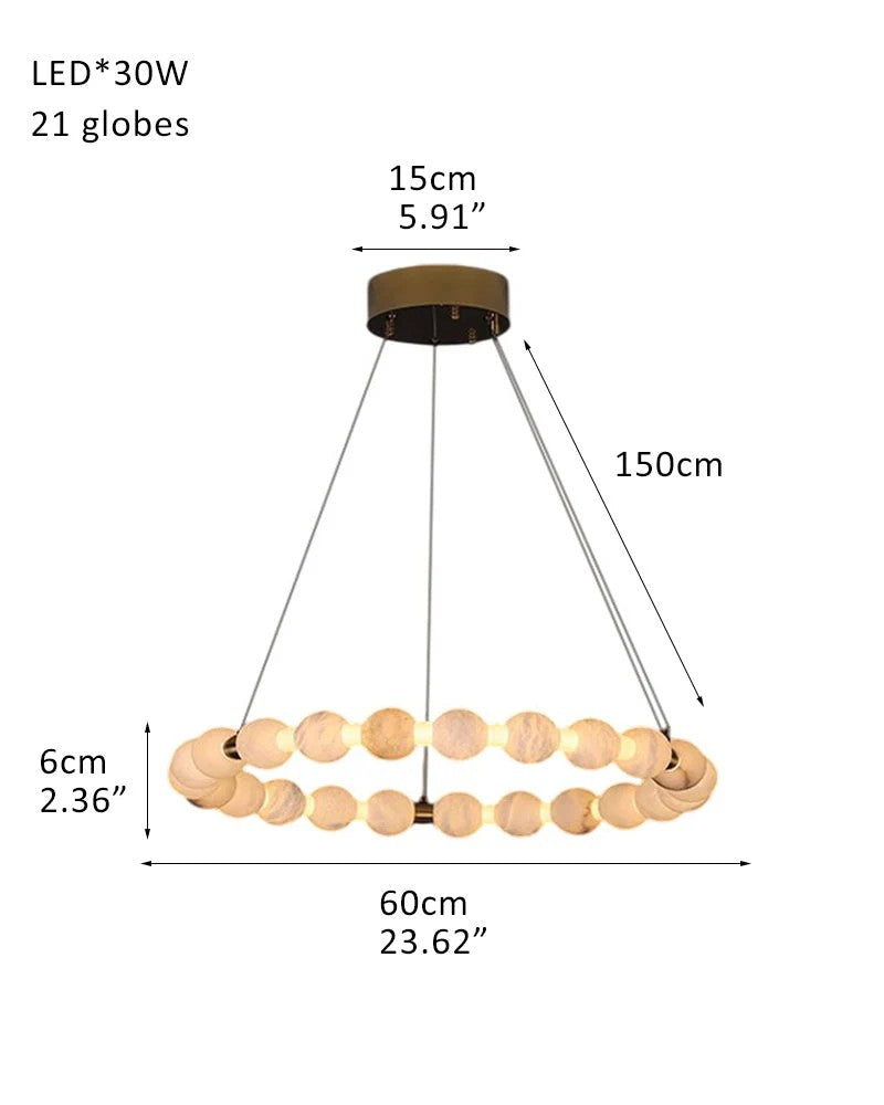 The Alabaster Cirque Ring Chandelier features a delicate ring of hand-polished alabaster beads, strung from a slim, modern metal frame. Warm light diffuses through the stone’s natural veining, creating a soft, halo-like glow that balances organic texture with minimalist sophistication. Available in varied sizes, it elevates dining tables, kitchen islands, or entryways with a luminous, refined focal point.