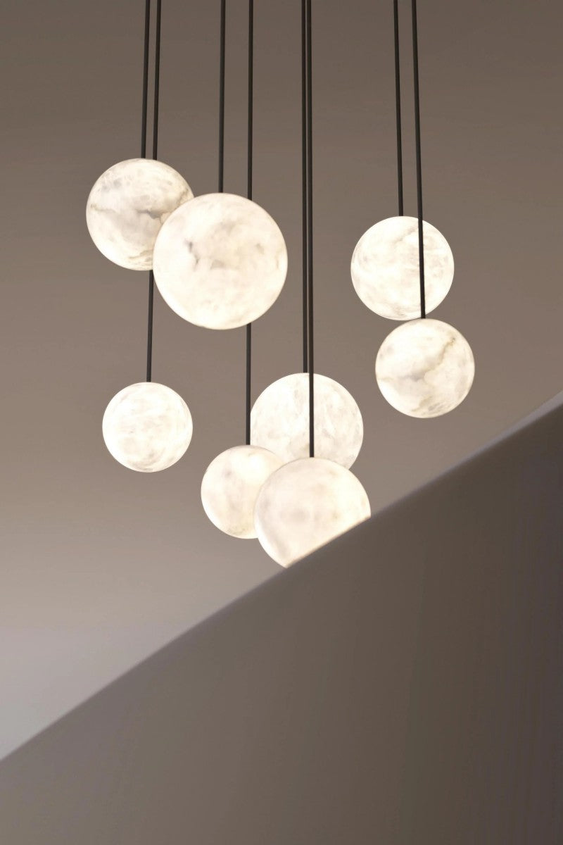 The Lunar Glow Collection features soft-glowing alabaster spheres (with natural veining) suspended in customizable clusters, paired with sleek metal canopies. Warm light diffuses through the milky stone, mimicking a moonlit glow—blending organic texture with minimalist elegance. Available in varied cluster sizes, it elevates dining spaces, foyers or open-concept rooms, adding a serene, luminous focal point to contemporary American interiors.