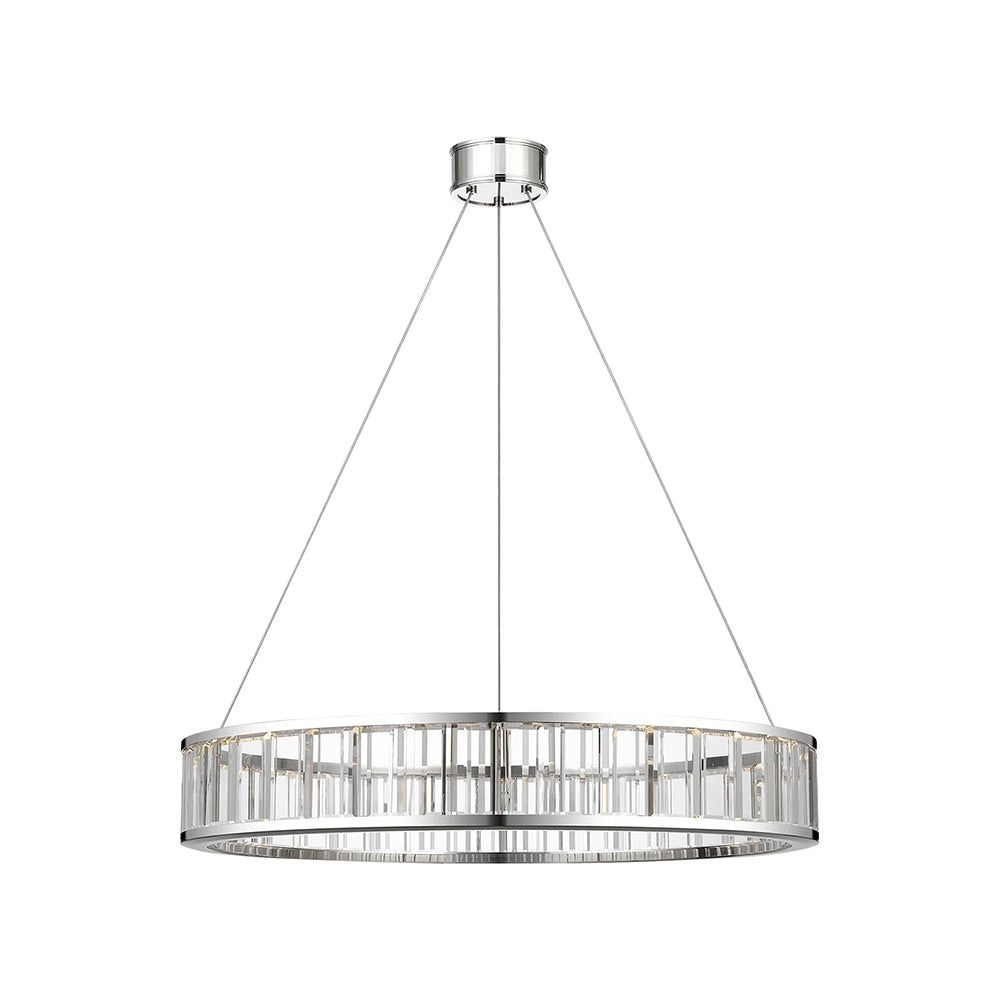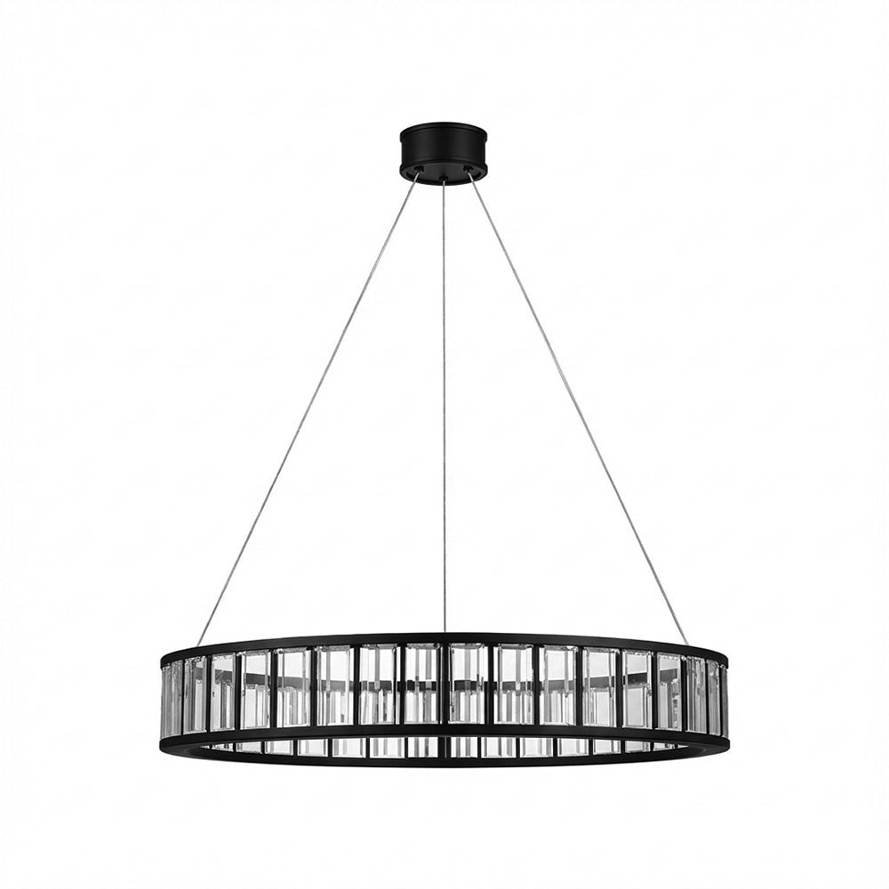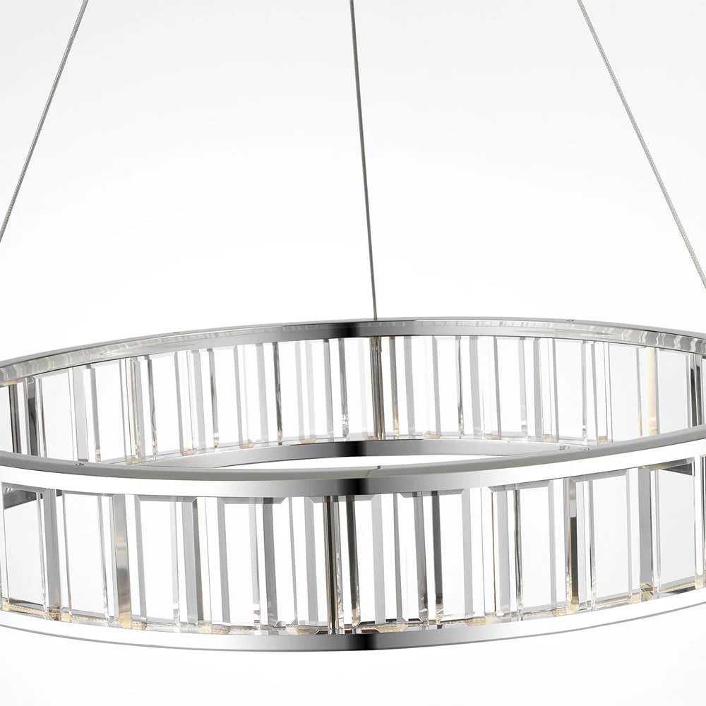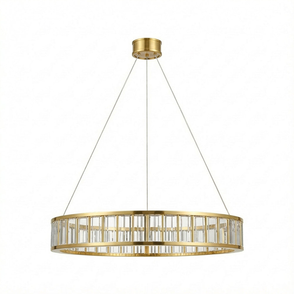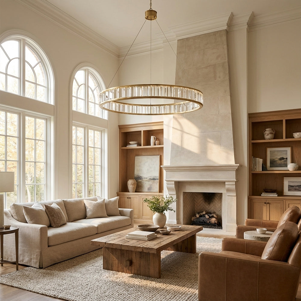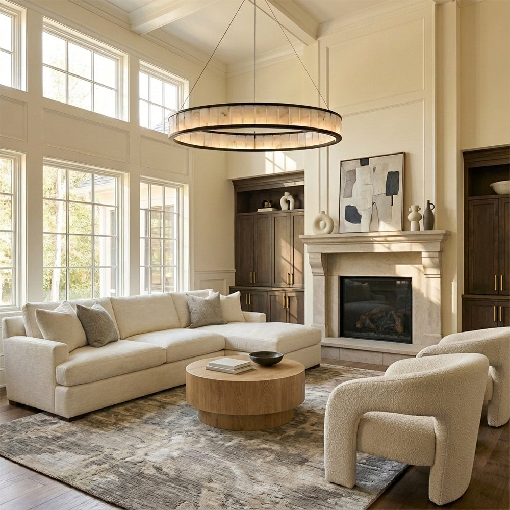 The Alabaster Round LED Ring Chandelier showcases circular frames wrapped in natural alabaster (or clear crystal) panels, paired with polished metal hardware (nickel/brass/black finishes). Soft light diffuses through the stone/crystal, casting a warm, luminous glow that balances organic texture with modern minimalism. Available in varied sizes, this statement piece elevates dining rooms or foyers—infusing contemporary American interiors with timeless, understated luxury.