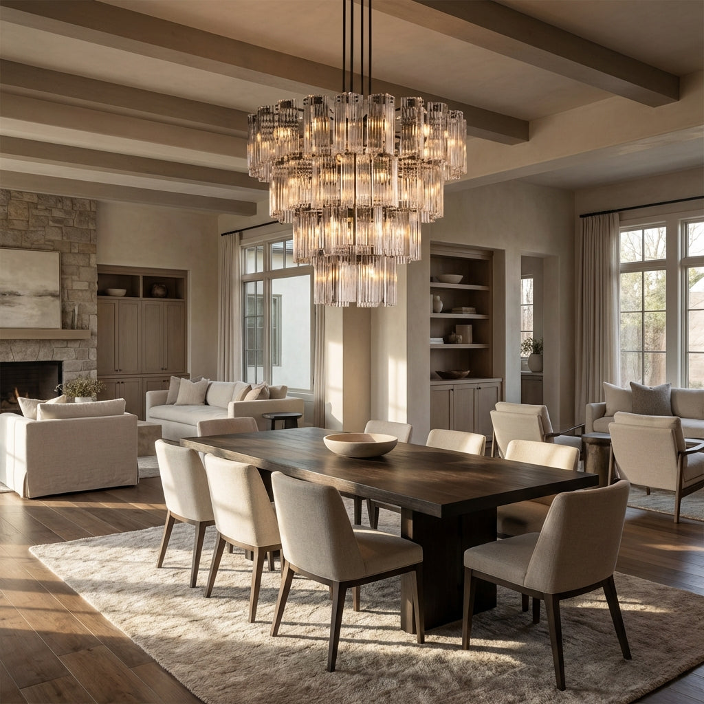 The Delsia Collection brings old Hollywood glamour into the modern era with a refined interpretation of classic silhouettes. Beveled glass panels are elegantly arranged around a steel frame, casting warm, radiant light and creating a dramatic yet timeless presence in any space.