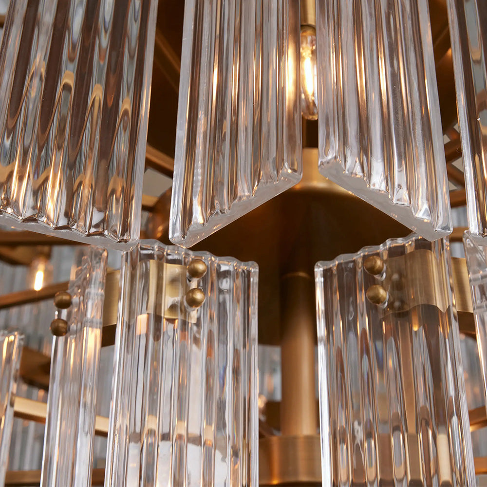 The Delsia Collection brings old Hollywood glamour into the modern era with a refined interpretation of classic silhouettes. Beveled glass panels are elegantly arranged around a steel frame, casting warm, radiant light and creating a dramatic yet timeless presence in any space.