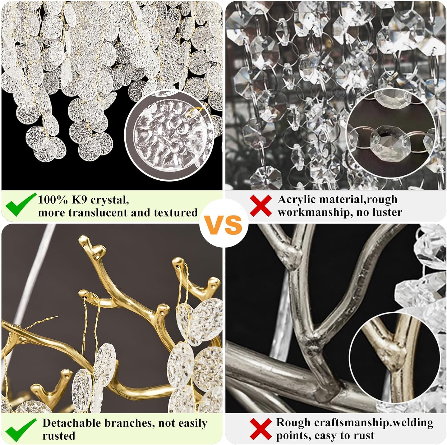 • 【Modern Tree Branch Chandelier】Drawing inspiration from classical art and designs reminiscent of ancient coins,our Modern Tree Branch Chandelier exudes a sparkling and luxurious charm,symbolizing abundance in love,career,family,and friendship. Crafted with exquisite gold decorative branches and stunning K9 transparent crystals that evoke purity and romance,this fixture shimmers like diamonds when illuminated,presenting a natural artistic beauty.Elevate your space with this stunning modern crystal chandelier,adding a touch of elegance to any room.