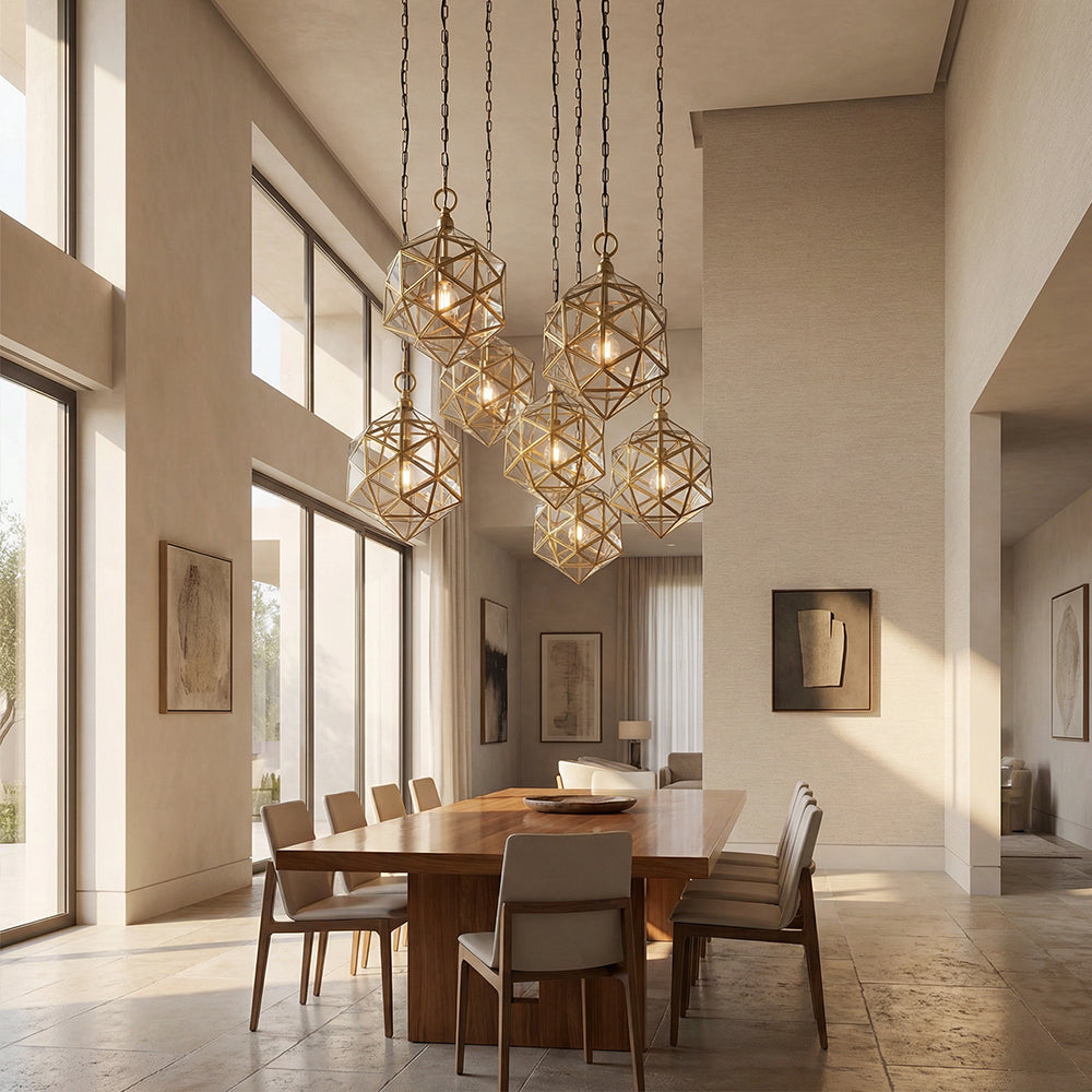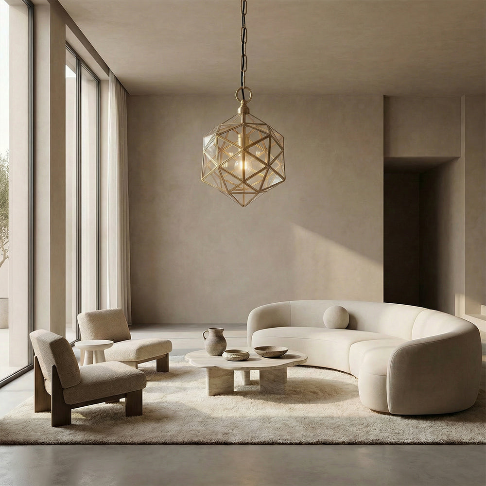 The Elixir Pendant reimagines geometric design with refined luxury. Handcrafted with an aged brass polyhedron frame and clear glass panels, it casts a bright, even glow while serving as a sculptural focal point.