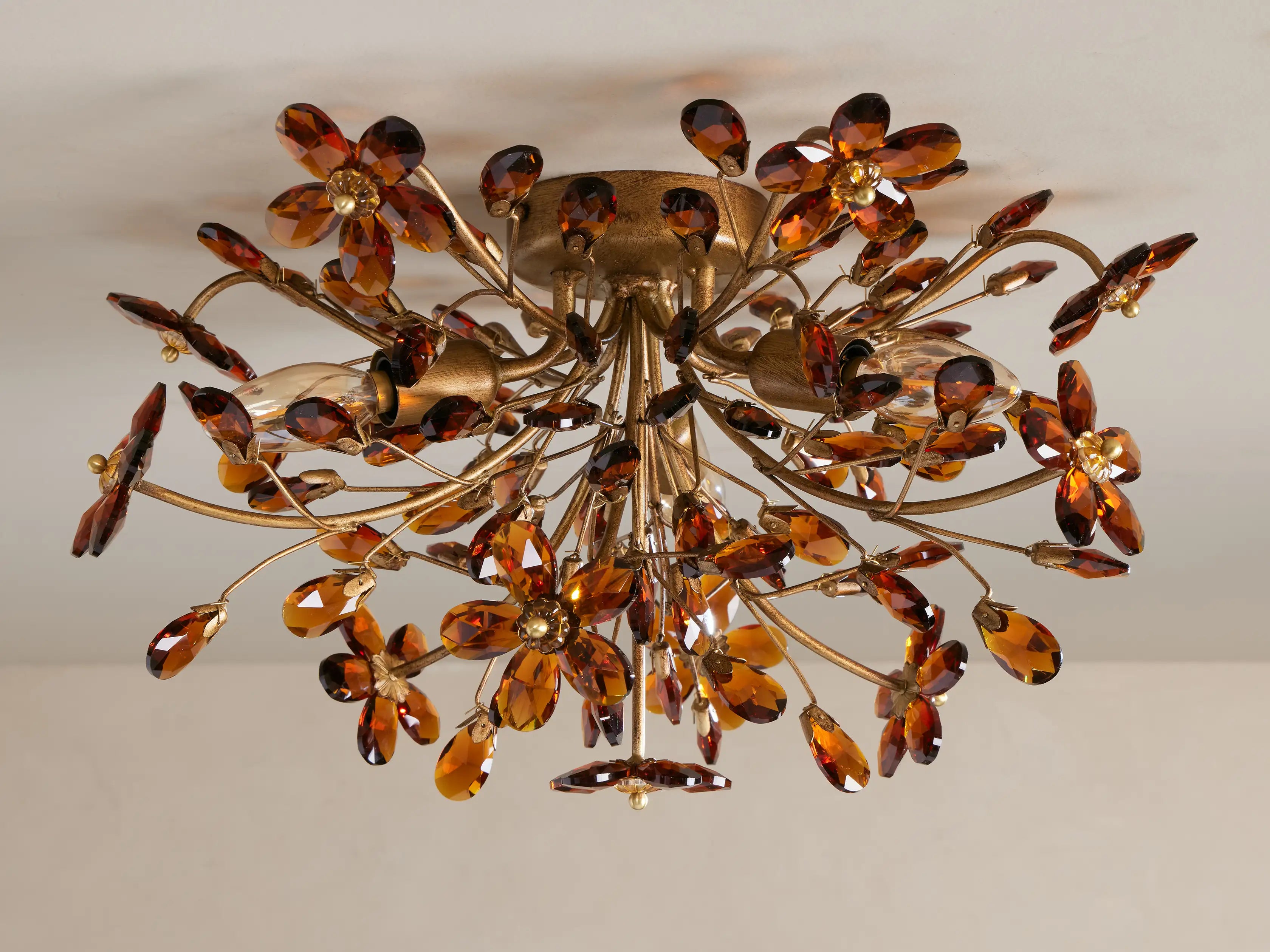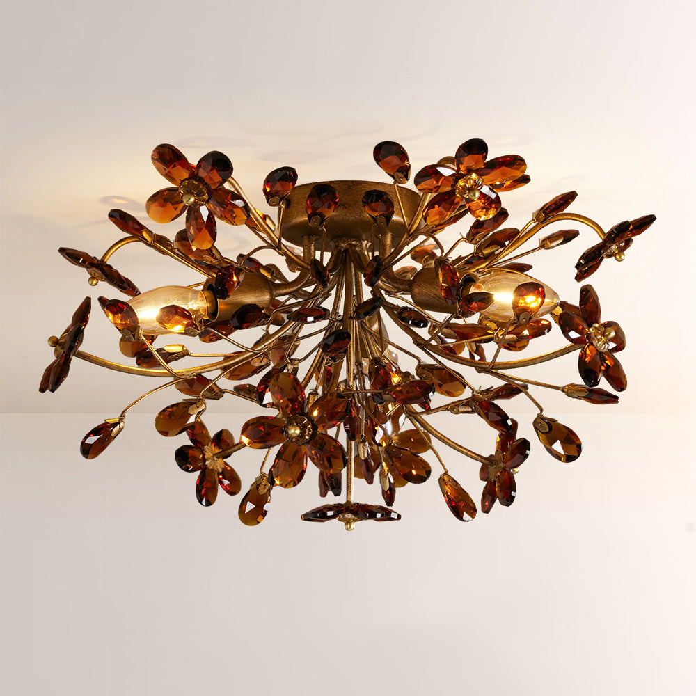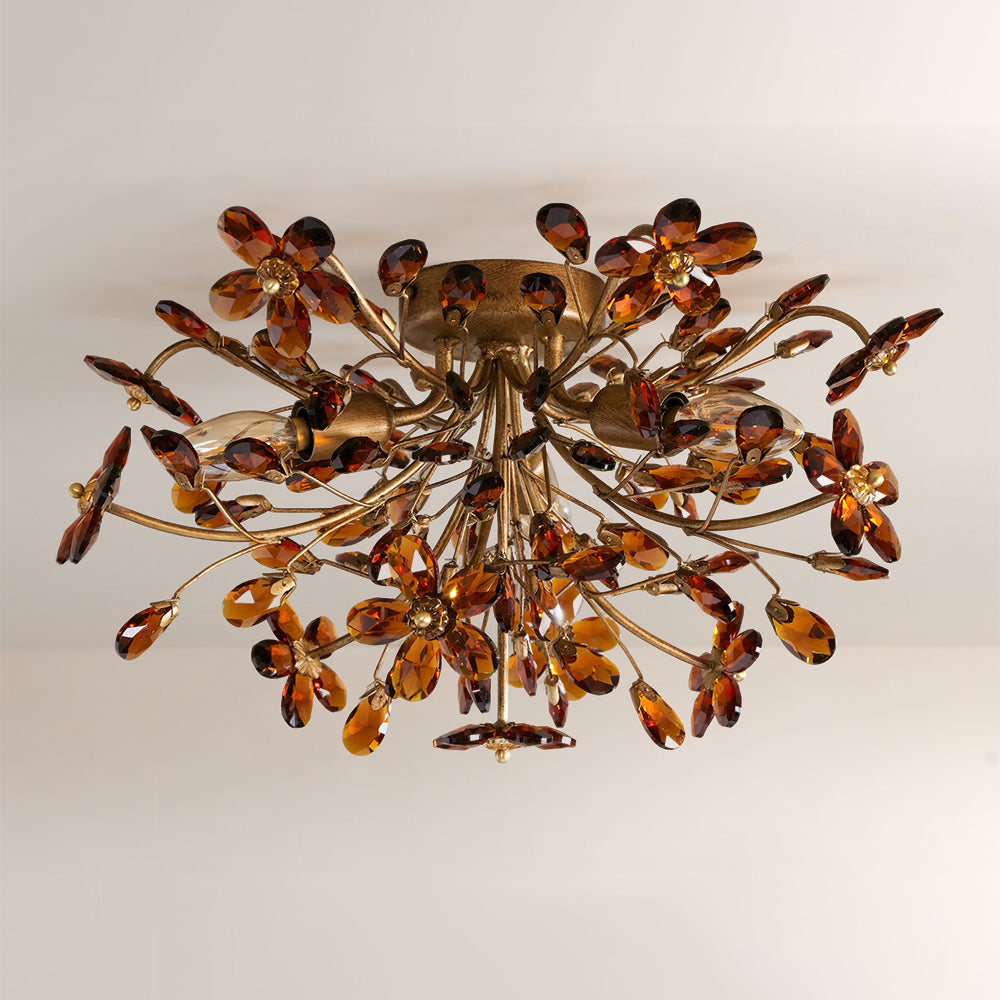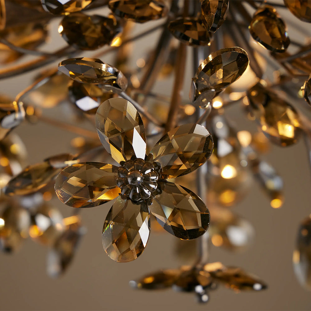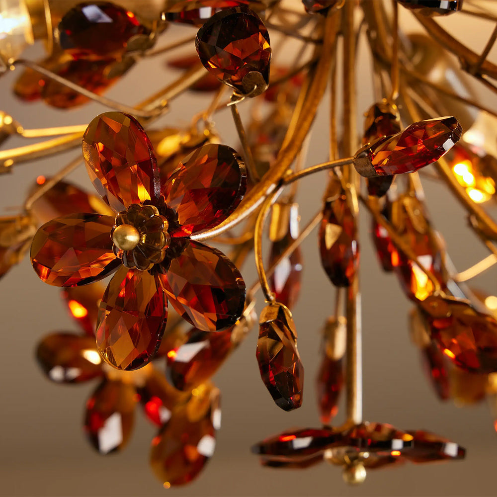 The Fiore Flush Mount is a whimsical masterpiece, featuring delicate crystal flowers and teardrop pendants cascading from a hand-finished metal frame. Available in dark bronze, antique gold, and clear or amber crystal options, it casts a luminous, romantic glow.