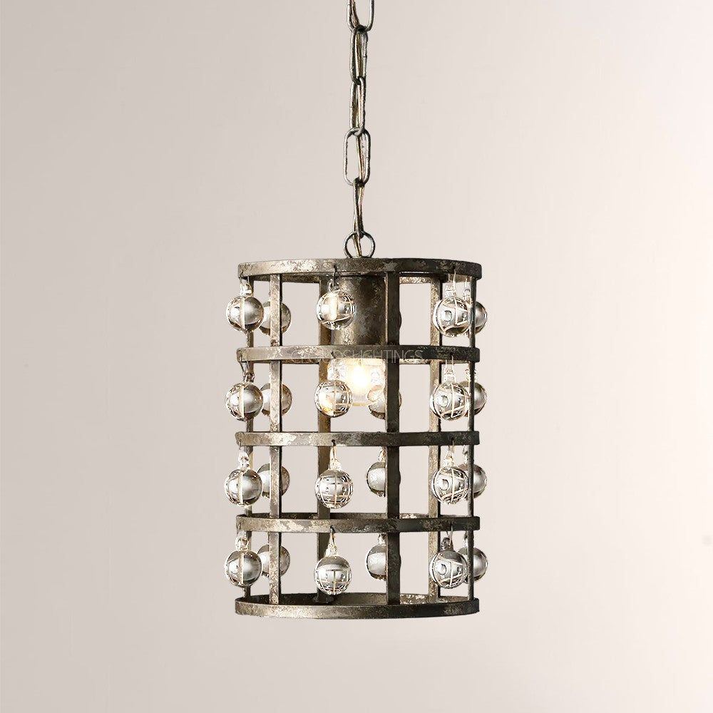 - Iron cage frame features an antiqued metallic finish complemented by Italian crystal spheres.
