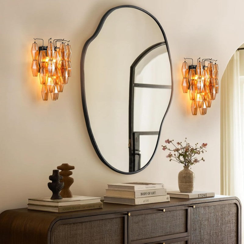 This Wall Sconce is suspended from a tiered steel frame with dozens of hand-blown glass polyhedra on individual hooks. Illuminated from within, the faceted chandeliers dramatically reflect and refract light. A tribute to the Italian lighting style of the 1950s with this minimalist style.