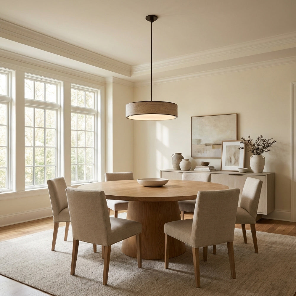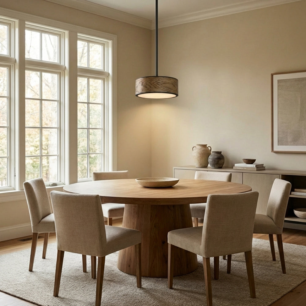 The Monterra Wood-Grain Drum Pendant Light features a natural wood-textured finish, matte metal trim, and a soft-diffusion shade. Its sleek cylindrical design emits warm, even light.