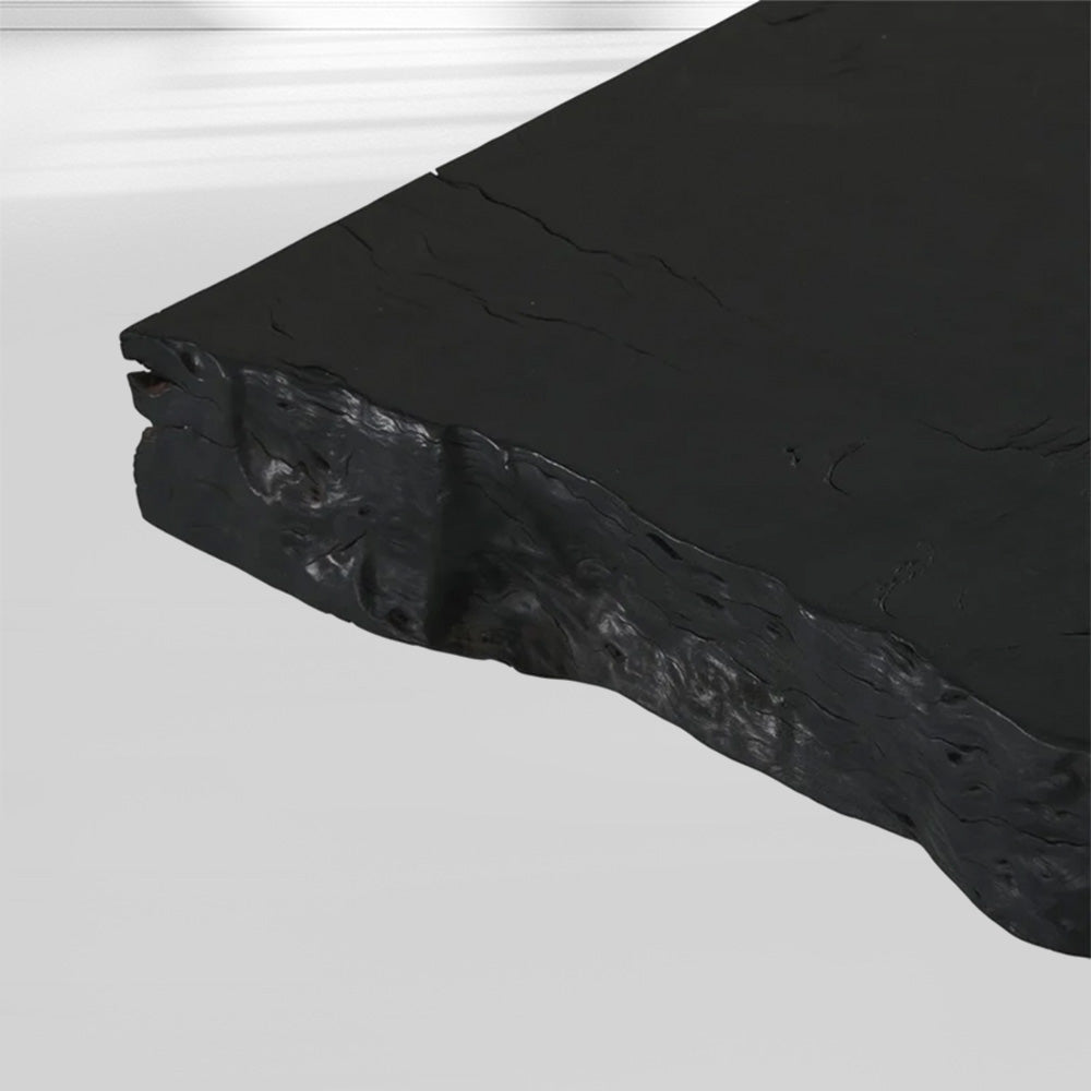 The NobPremier - series coffee table features an organic shape with a burnt noir finish, handcrafted from a solid slab of sustainably sourced flower wood. It brings bold, unique style to contemporary interiors, with each piece capturing the textural richness and distinctive detail of the organic timber. Slight irregularities in shape, color, or finish are inherent, while natural splitting, cracking, or oil loss over time (due to timber hardness and moisture variations) are celebrated as testaments to the wood’s natural life and beauty.
