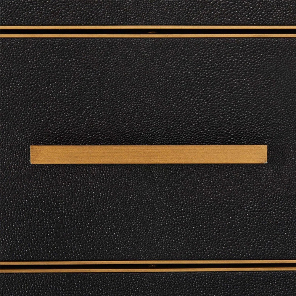 The Sebastien Series Chest of Drawers features a sleek black finish complemented by brass accents and a modern metal base, blending luxury design with functional storage. It’s an ideal statement piece for upscale American bedrooms or living spaces, offering a design that balances refined aesthetics with ample organizational capacity, perfect for elevating high-end interiors with its sophisticated, glamorous vibe.