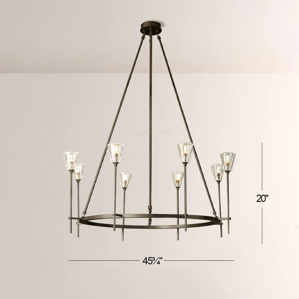 The torch form is distilled to its essence in this chandelier. The tapered glass shades are reminiscent of French neoclassical designs, while the solid brass frame is decidedly modern.