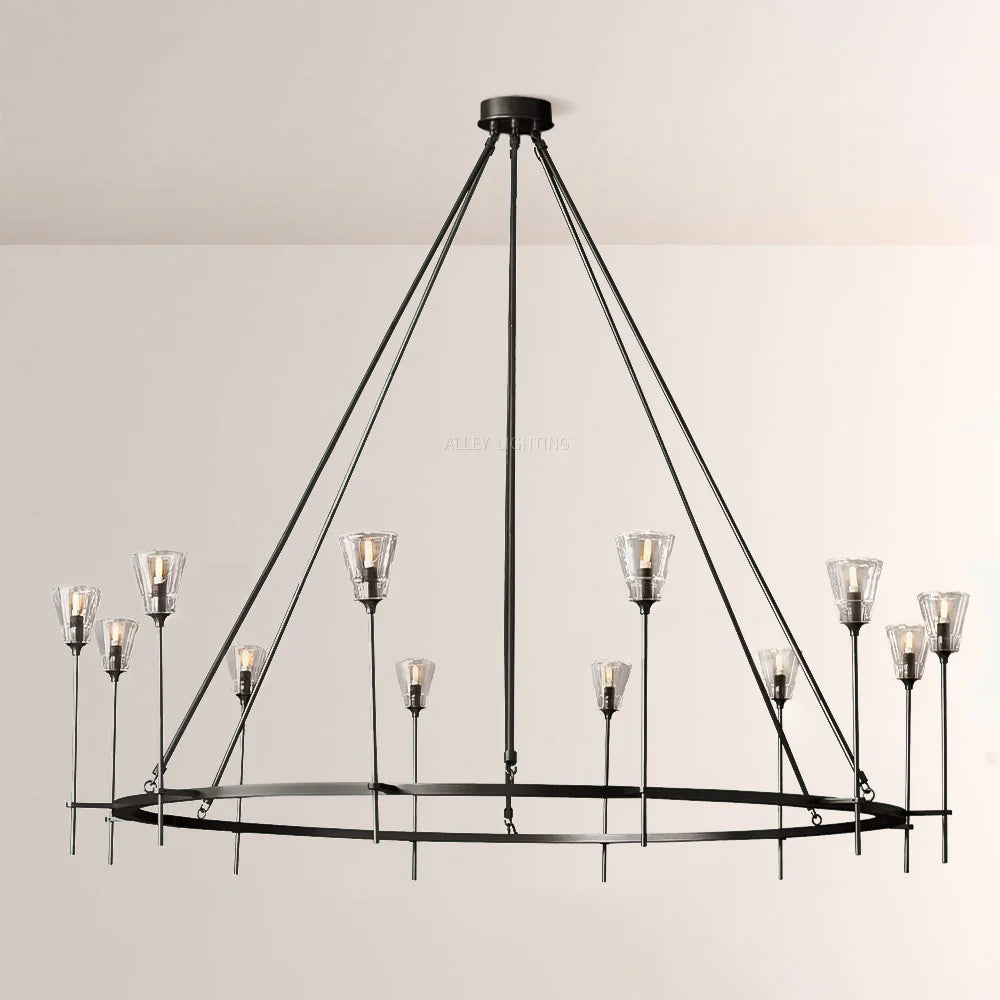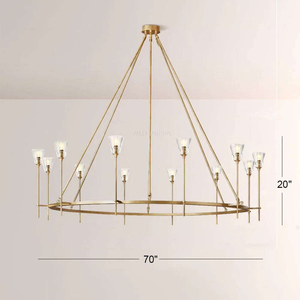 The torch form is distilled to its essence in this chandelier. The tapered glass shades are reminiscent of French neoclassical designs, while the solid brass frame is decidedly modern.